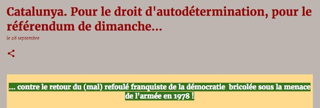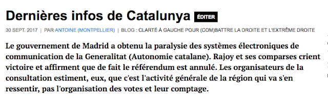 Catalunya aujourd'hui. Des queues très tôt le matin sous la pluie. La police espagnole qui force des bureaux de vote matraques à la main. La police catalane qui observe et ne bouge pas : elle n'a pas appliqué l'ordre de fermer les collèges électoraux, du moins ceux qui sont occupés. Le gouvernement autonome catalan qui proclame le système des "listes électorales universelles" qui permet de voter là où on peut. Le président de la Généralité a ainsi voté dans un centre différent du sien qui a été investi par les forces du désordre. Le vote se fait par des procédures manuelles là où l'informatique ne fonctionne pas. La maire de Barcelone dénonce l'occupation policière de la ville : "ville de paix qui n'a pas peur" ! La tension monte, quelques affrontements par-ci, par-là... Madrid exprime sa crainte que le gouvernement catalan ne proclame l'indépendance unilatérale... Quelques photos ci-dessous. A l'instant: Catalunya. Les charges policières se multiplient. Principalement à Barcelone pour ce que l'on en sait.