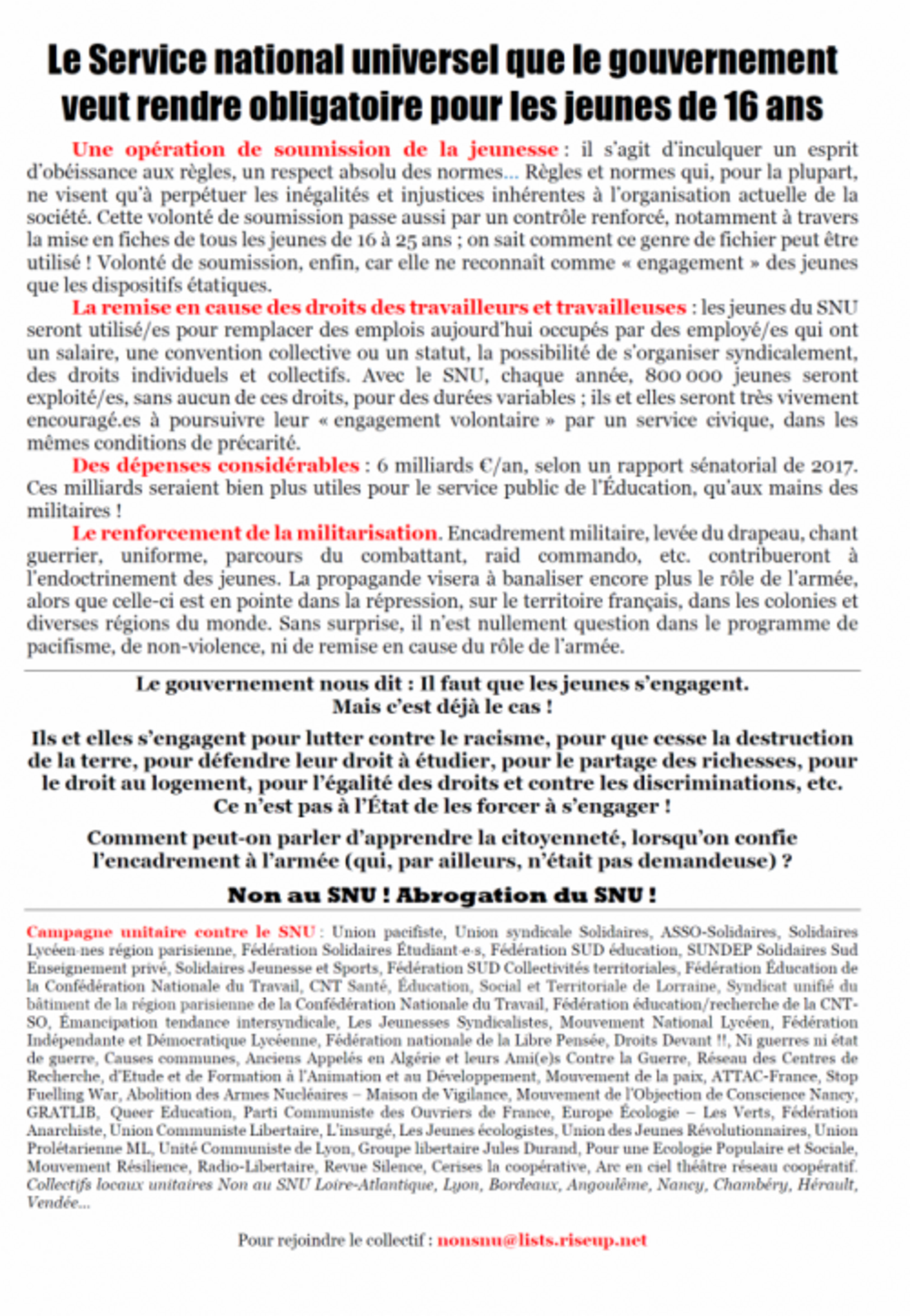 Communiqué/tract du collectif Non au SNU mettant en avant le fait que le gouvernement est toujours en dessous de ses objectifs en termes de volontaires.