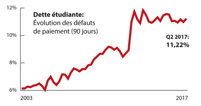 Aux États-Unis, la dette étudiante a dépassé 1350 milliards de dollars en 2017 et le pourcentage de défauts de paiement atteint plus de 11 % |5|. Une bulle immobilière s’est formée au Canada |6|, 19 mai 2017.]. La dette des ménages aux États-Unis a dépassé début 2017 le niveau qu’elle avait atteint en 2008 avant la faillite de Lehman Brothers. Le volume total de la dette des ménages avoisine 13 000 milliards de dollars. Les défauts de paiement sont cependant inférieurs à ce qu’ils étaient en 2008-20096.
