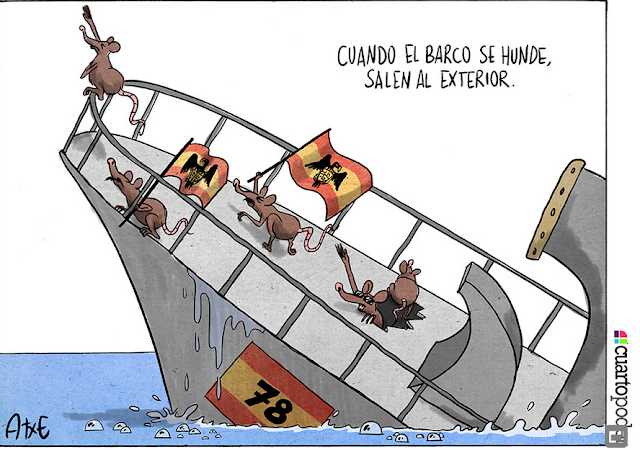 Quand coule le bateau du régime de 78 (1978, année du référendum constitutionnel instituant la démocratie par "transition" depuis la dictature), les rats fascistes sortent de leur trou, ils étaient nichés dans les soutes... Le drapeau arboré par ces rats sont le drapeau "préconstitutionnel", celui qui, frappé de l'aigle, est l'emblème de la dictature. Cliquer ici