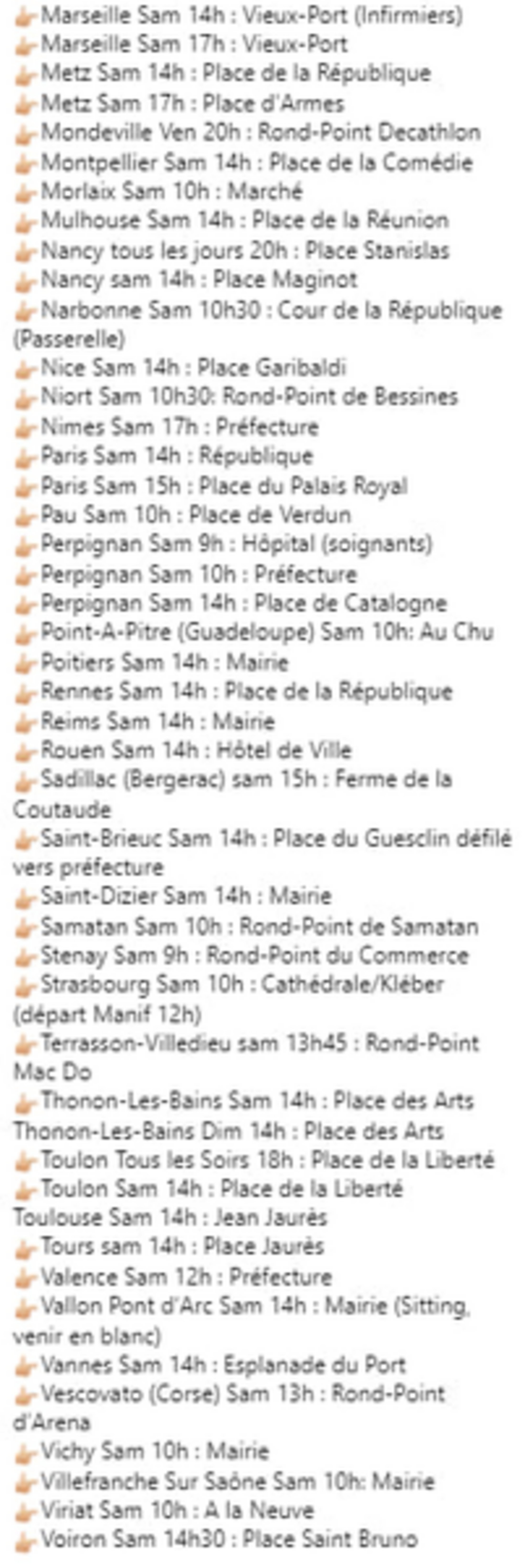 Attention, contrairement à ce qui est indiqué sur cette liste, Saint-Brieuc Sam 15h : Rond point Brezillet et Strasbourg  changement d'horaire 13h place Kleber départ manif 14h.