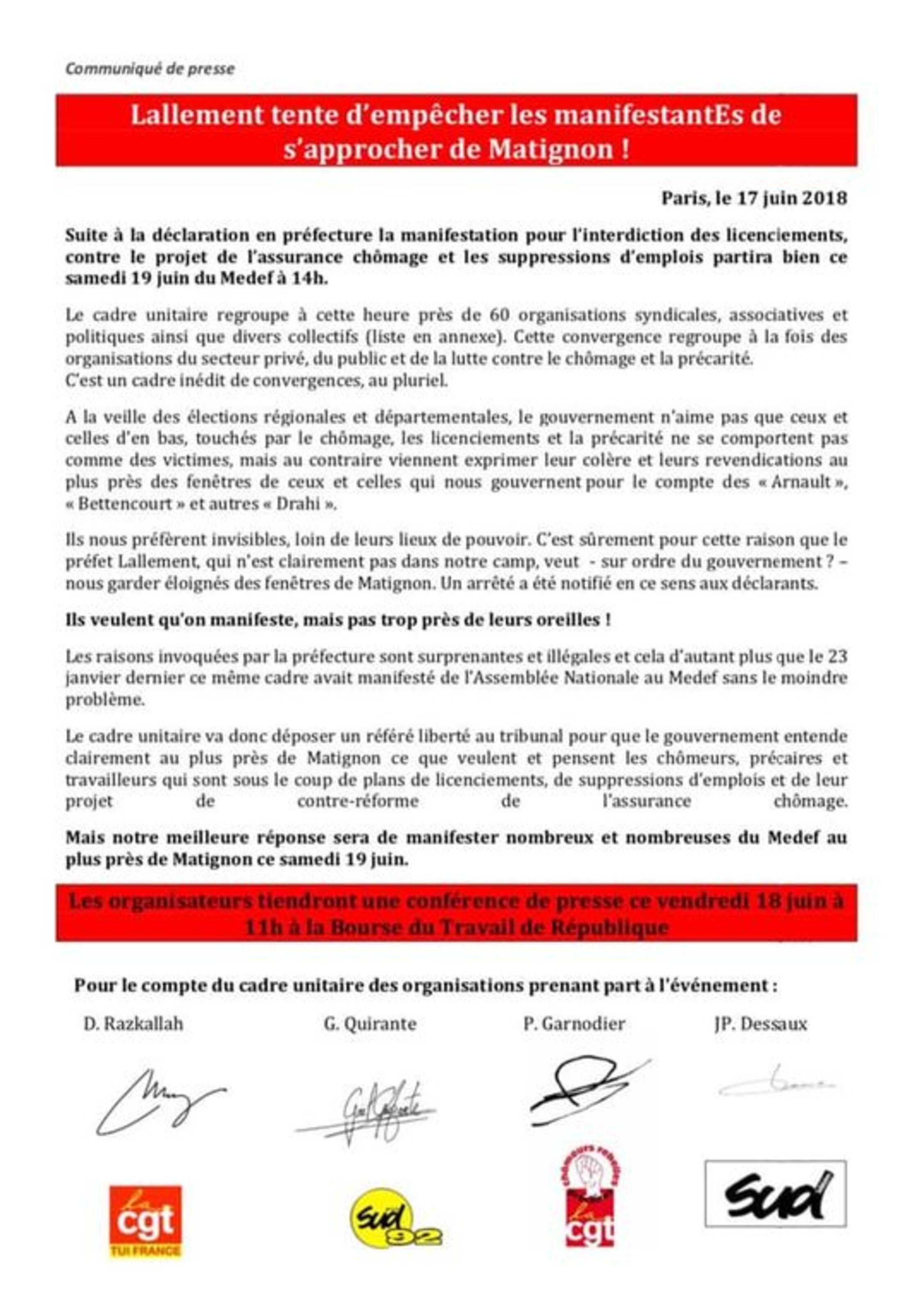 L manifestation pour l’interdiction des licenciements, contre le projet de l’assurance chômage et les suppressions d’emplois partira samedi 19 juin du Medef à 14h. Le cadre unitaire regroupe déjà près de 60 organisations syndicales, associatives et politiques ainsi que divers collectifs. C’est un cadre inédit de convergences, au pluriel.