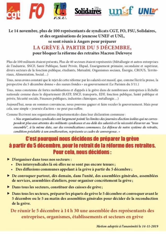 Intersyndicale Angers : grève à partir du 5 décembre !