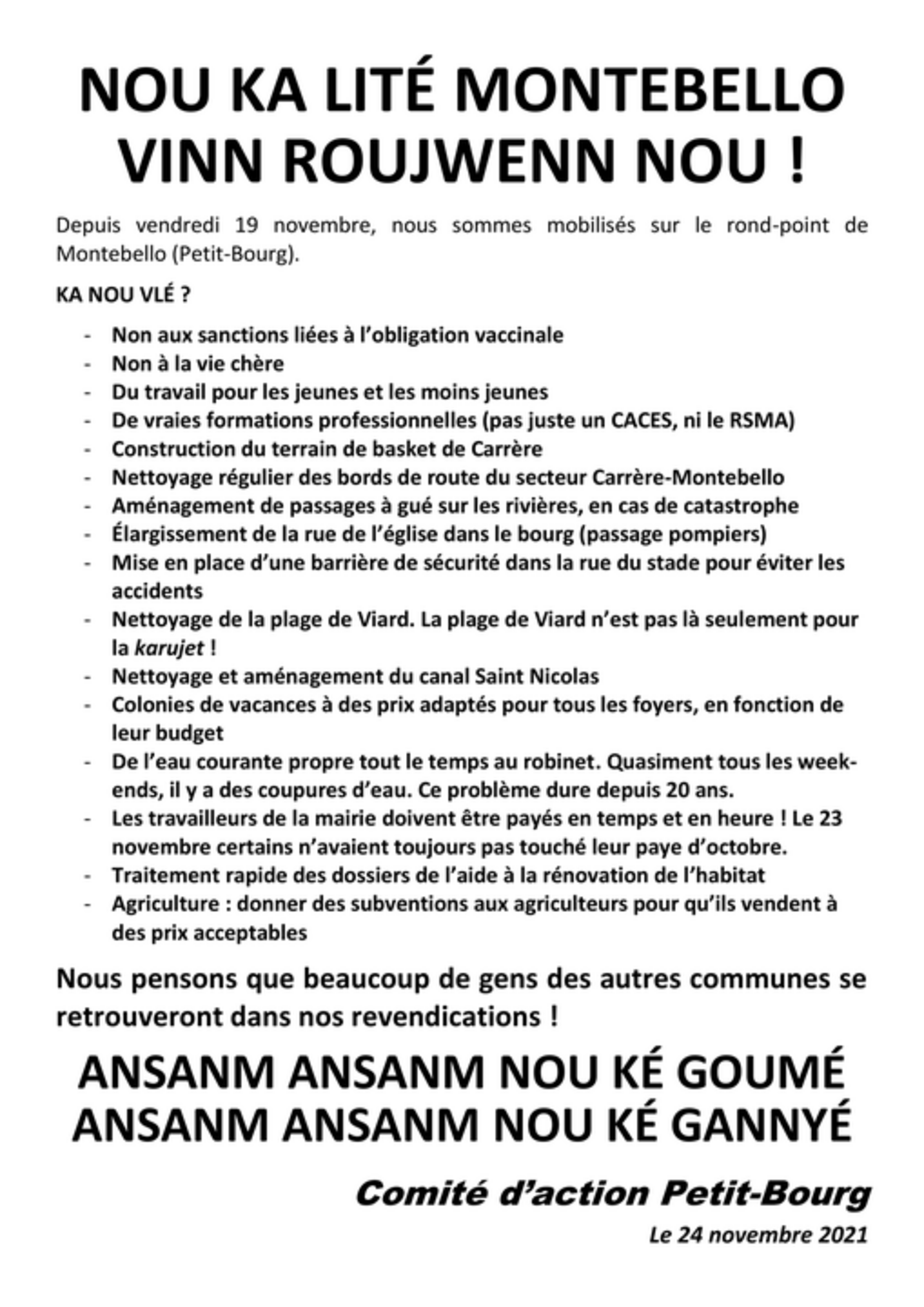 Ces comités de base de quartier et de barrage se nomment fort à propos des "républiques", le préfet n'étant que le représentant d'un Etat colonial, certainement pas d'une république. Ici le programme du comité d'action du rond-point de Montebello (Petit Bourg). Au travers les revendications on peut mesurer l'ampleur, la pertinence et la profondeur du mouvement.
