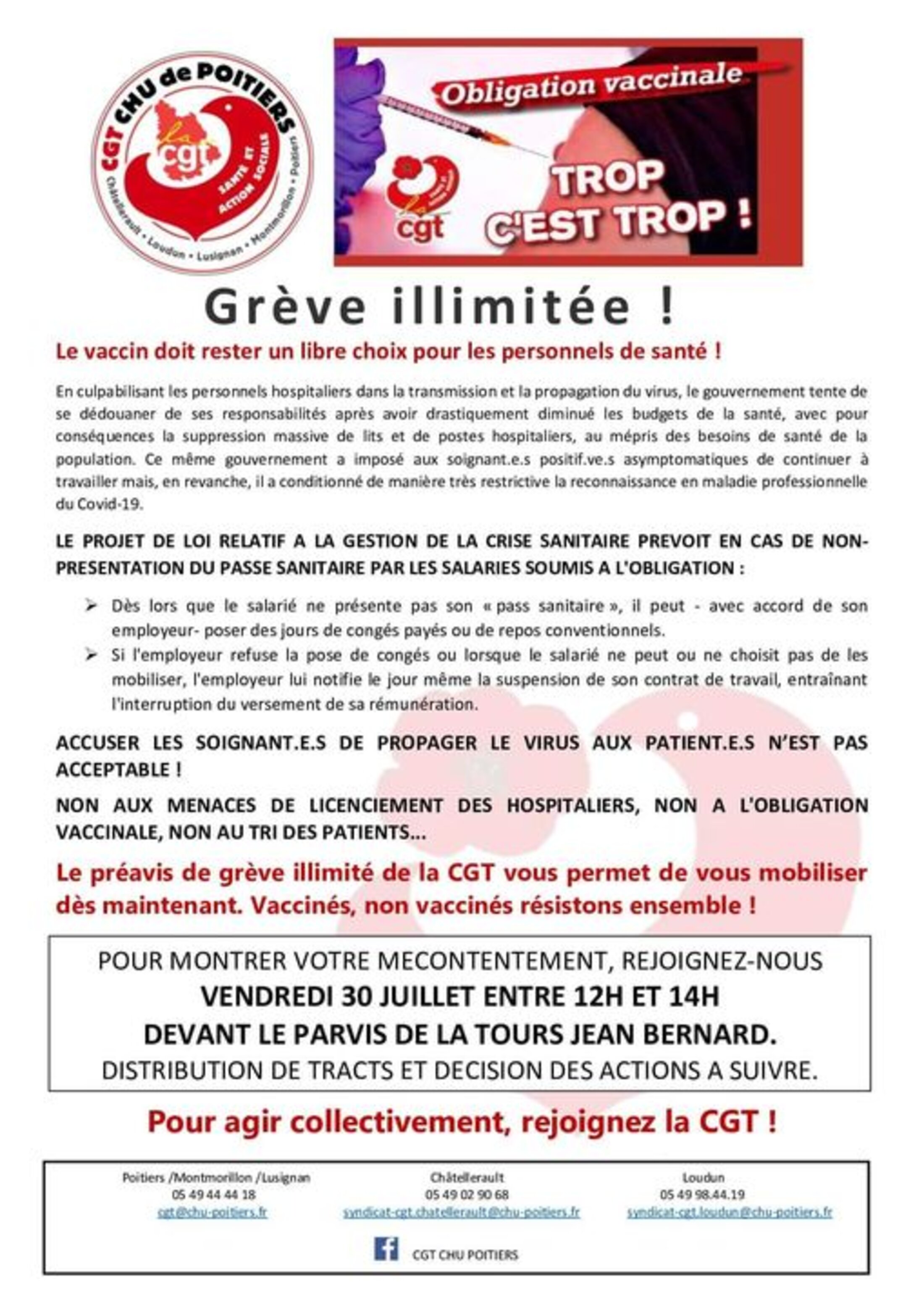 Après les hôpitaux de Montélimar, Lyon, Bastia, La martinique, l'hôpital de Poitiers appelle à la grève illimitée contre le pass sanitaire et l'obligation vaccinale