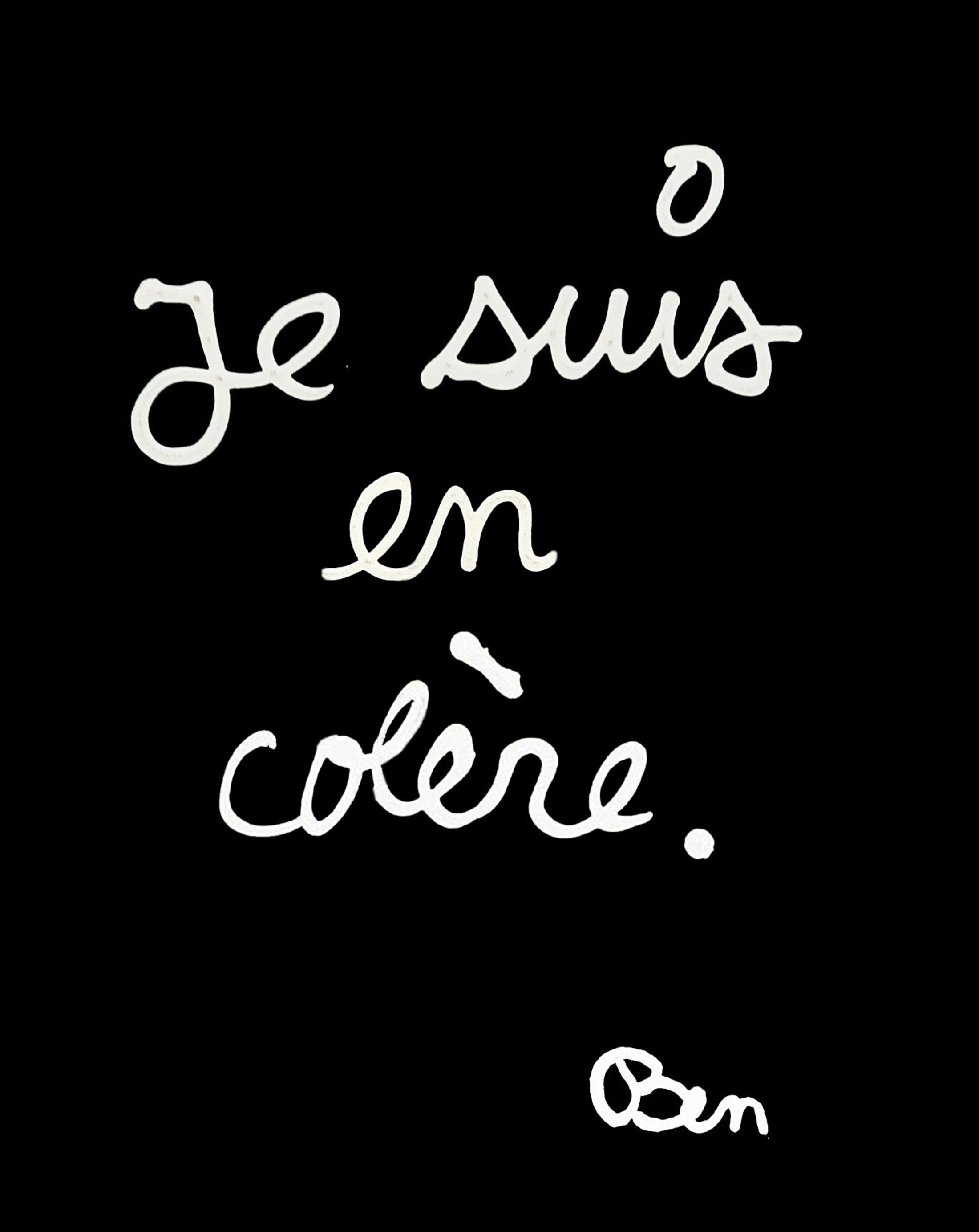 L'article sur la crise au Centre Pompidou, Avec sa fermeture prochaine, le Centre Pompidou plonge dans la tourmente, avec l'évocation d'une pancarte "Colère noire sur fond blanc", en référence au tableau de Malevitch, m'a fait penser, par antonymie, à une colère blanche sur fond noir, qu'aurait pu réaliser Ben, que j'aime beaucoup. C'est évidemment un montage. J'ignore la position de Ben (qui est toujours vivant !) sur ce conflit. J'aimerais bien la connaître, d'ailleurs. Cela me fait toujours bizarre de lire ses maximes un peu libertaires sur toutes les trousses, les agendas et autres fournitures scolaires de nos ados. Sans compter les tee-shirts. D'un côté, ça ressemble bien à de la récupération commerciale, mais au fond ses idées valent mieux que d'autres et donnent à réfléchir. A ma connaissance, c'est le seul artiste qui a réussi à s'insérer ainsi dans de multiples objets de la vie quotidienne. Bien plus que l'Angélus de Millet sur les assiettes de nos grands-parents. Il doit cependant se faire un pognon de dingue et je me demande de quel côté il est, dans ce débat où les puissances de l'argent jouent un rôle majeur.