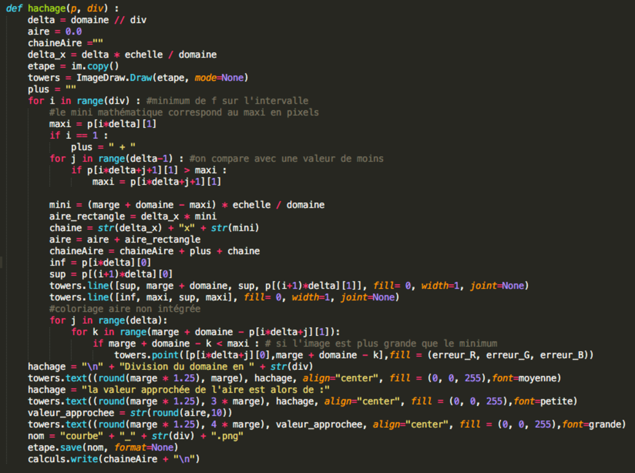 Enfin, on a déjà parlé ensemble de la beauté des mots. Il ne faut pas oublier celle des textes, constitués de mots. En plus de la beauté de ses mots, un texte apporte la beauté de ses idées, de ses structures, de ses rythmes. Eh ben, un programme, c'est beau ! Avec l'éditeur qu'on utilise, qui utilise un code de couleurs pour aider à sa compréhension, c'est même féerique ! Voilà la fonction qui produit une image correspondant à une subdivision du domaine.