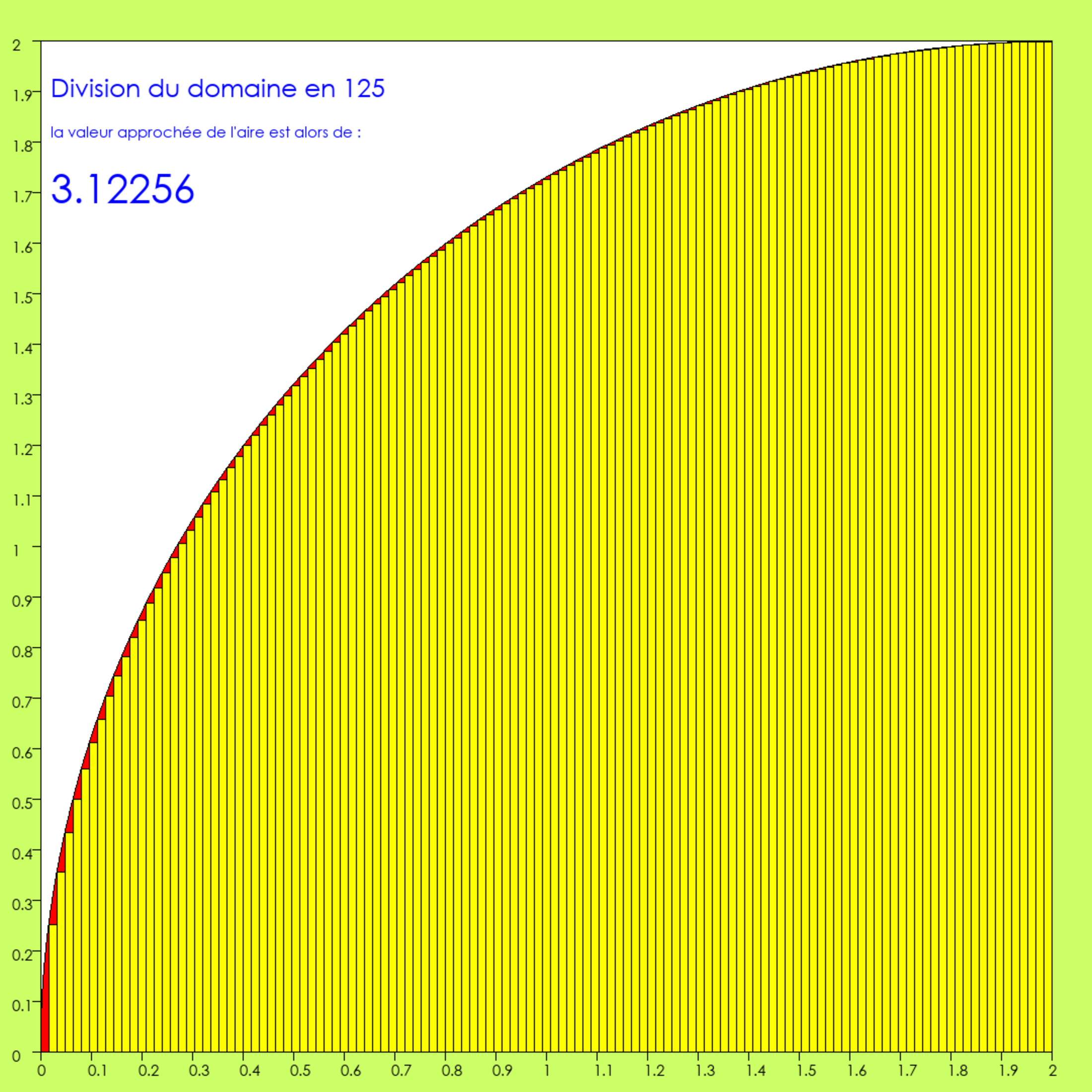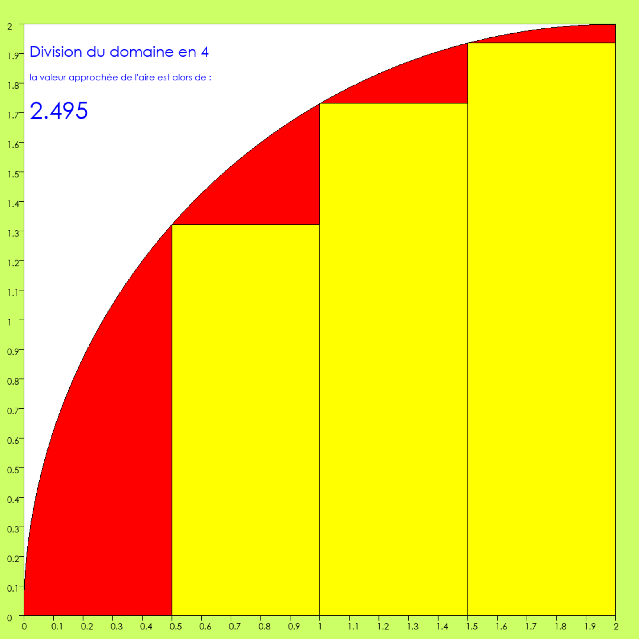 C’est mieux ! Le domaine est divisé en 4 parties. On a toujours un rectangle de moins que de subdivisions. La zone rouge diminue, la zone jaune augmente. Moins d’erreur, meilleure approximation. La nouvelle valeur résulte de ce calcul : 0.5x0.0 + 0.5x1.322 + 0.5x1.732 + 0.5x1.936