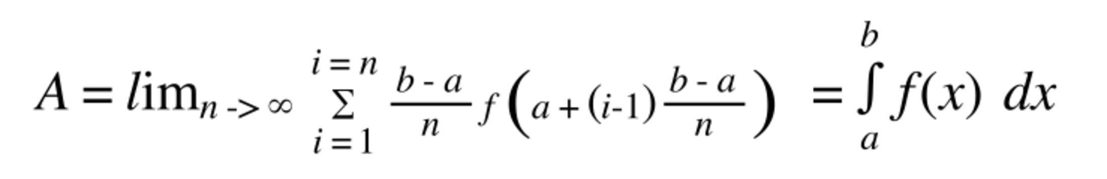 L'idée que la valeur exacte de l'aire sous la courbe d'une fonction f entre deux valeurs a et b de la variable x se calcule de cette façon est ainsi formulée :