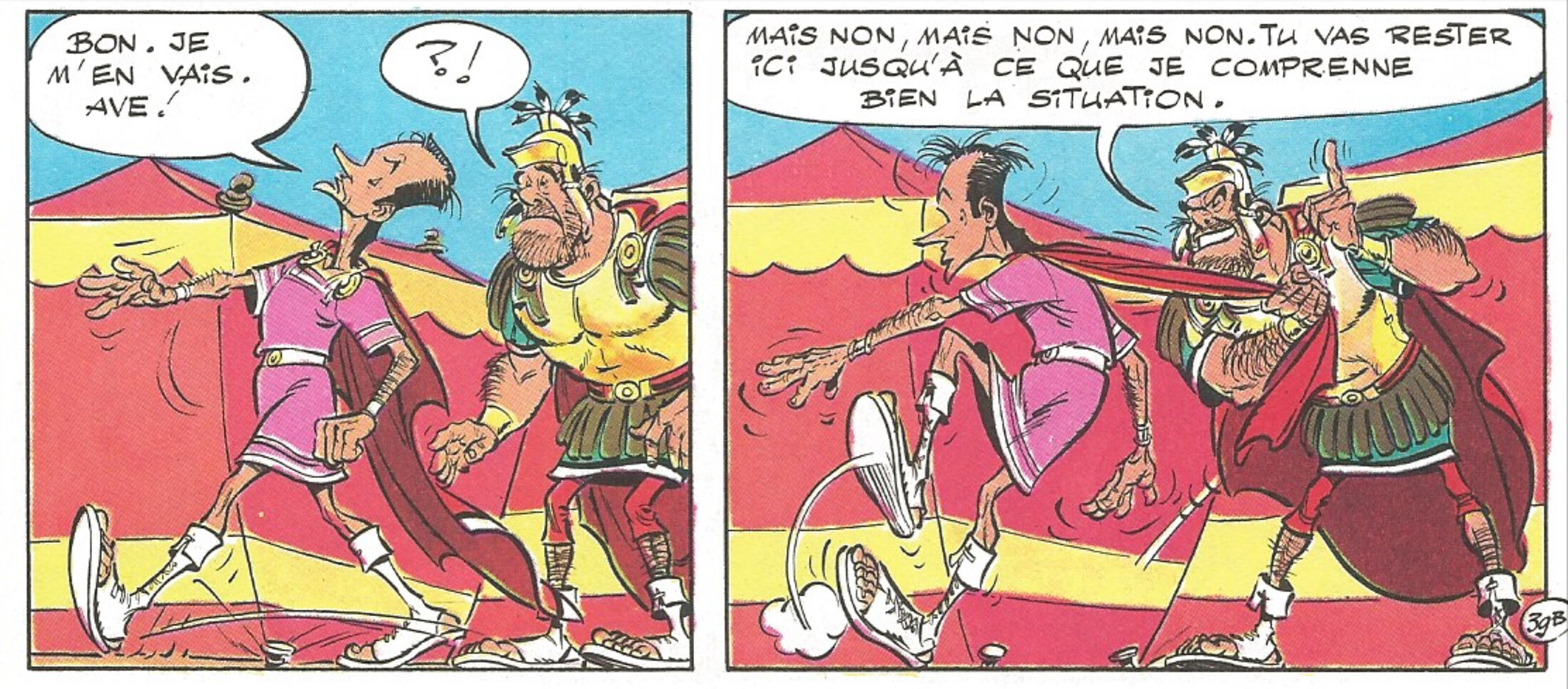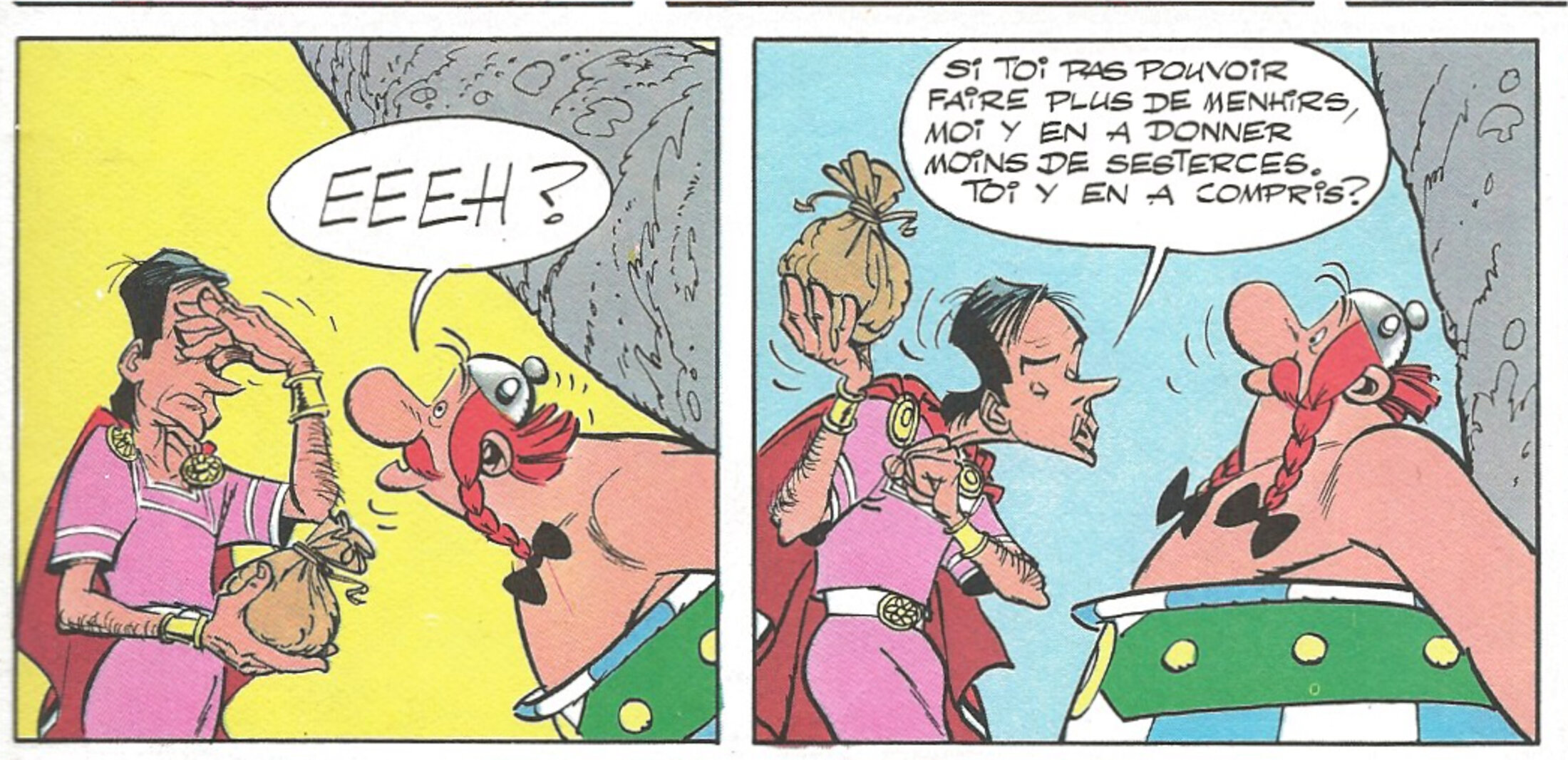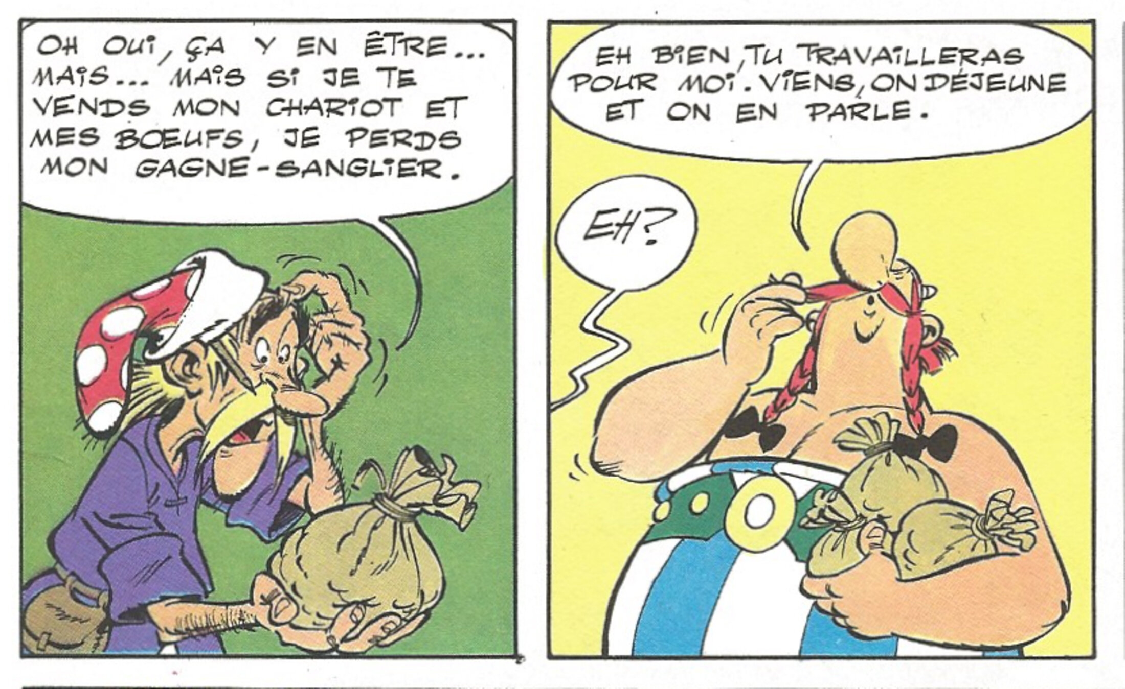 Convaincu par ce que le Romain lui fait miroiter, Obélix se met au travail. Mais il n’a plus le temps de chasser. Et comme, impatient de travail et de réussite, il a envoyé chier Astérix, celui-ci ne lui fait pas bon accueil quand il vient le voir à l’heure du repas. Alors la première contamination commence :