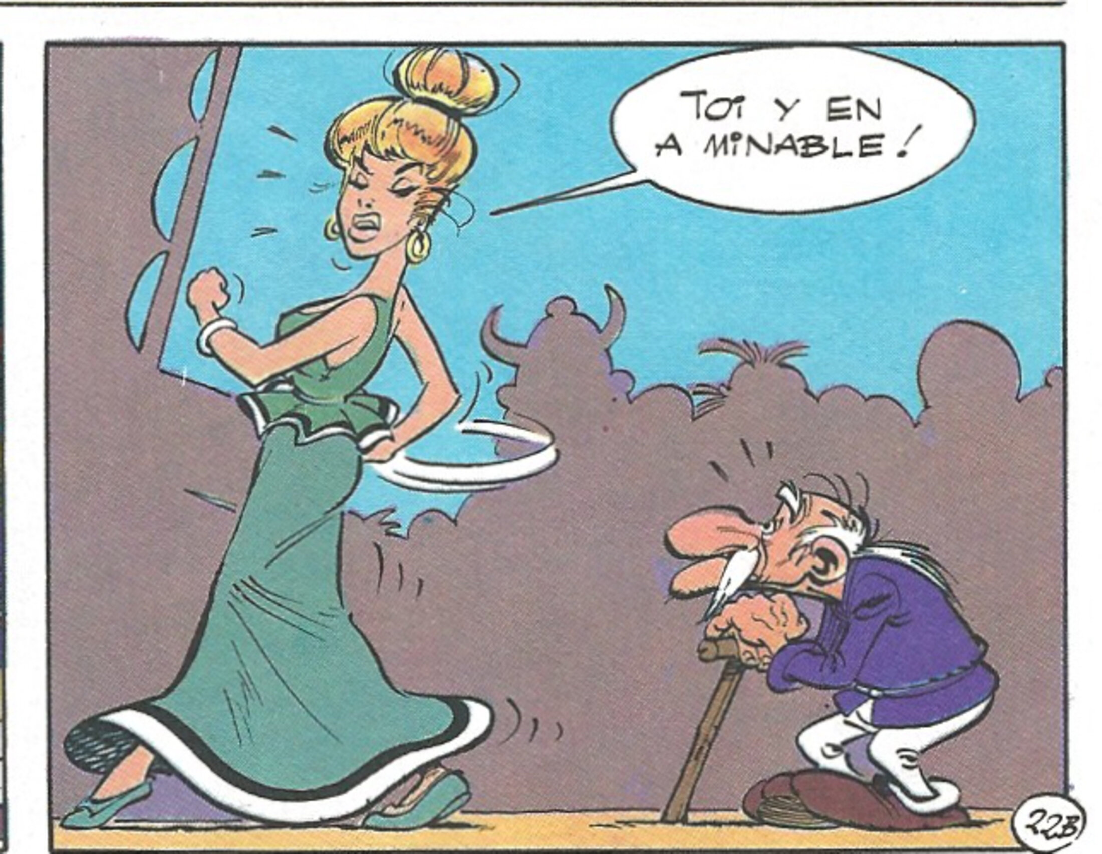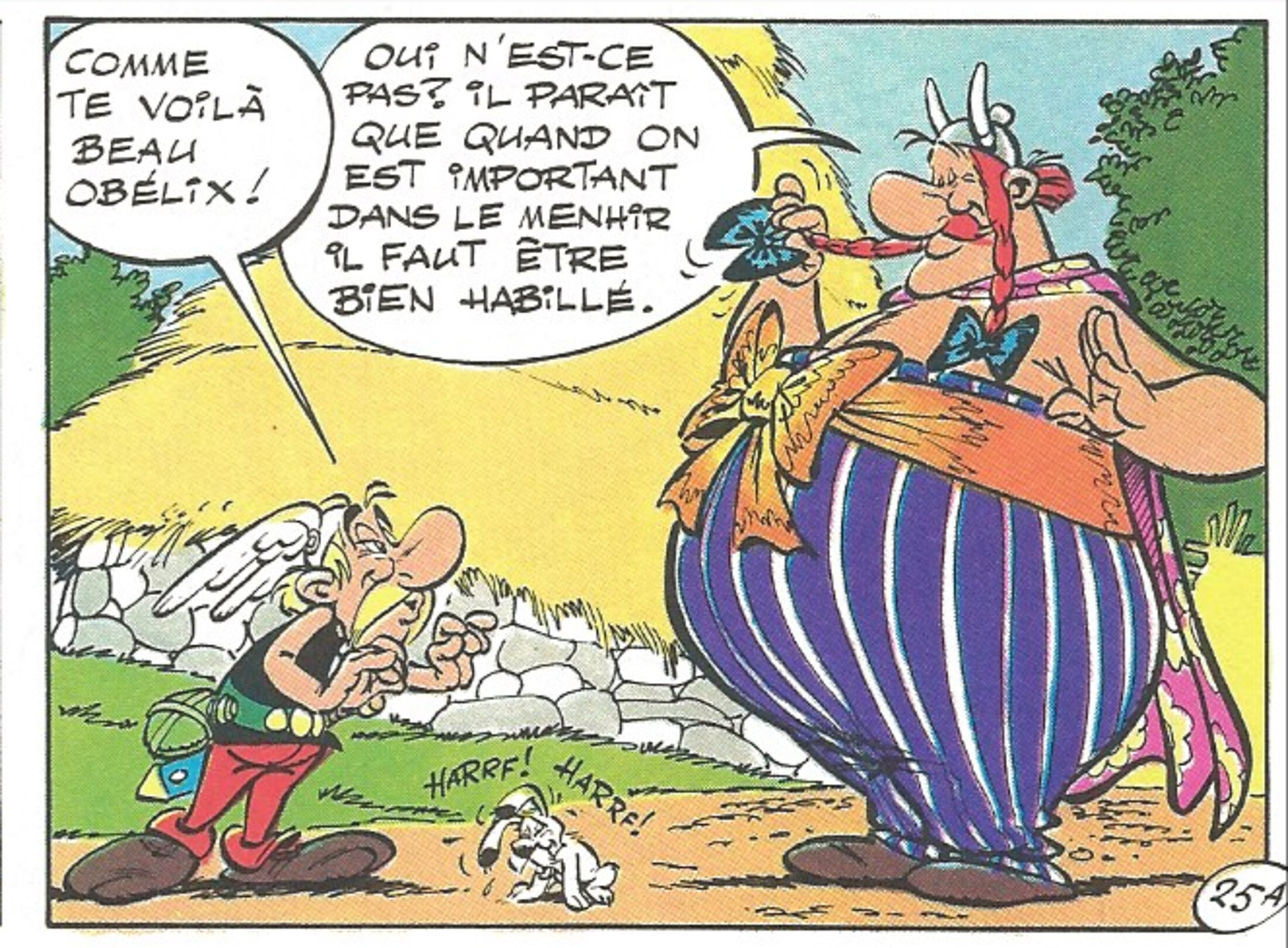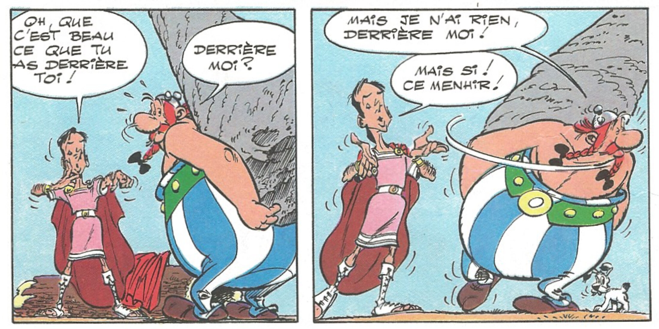 Convaincu par ce que le Romain lui fait miroiter, Obélix se met au travail. Mais il n’a plus le temps de chasser. Et comme, impatient de travail et de réussite, il a envoyé chier Astérix, celui-ci ne lui fait pas bon accueil quand il vient le voir à l’heure du repas. Alors la première contamination commence :