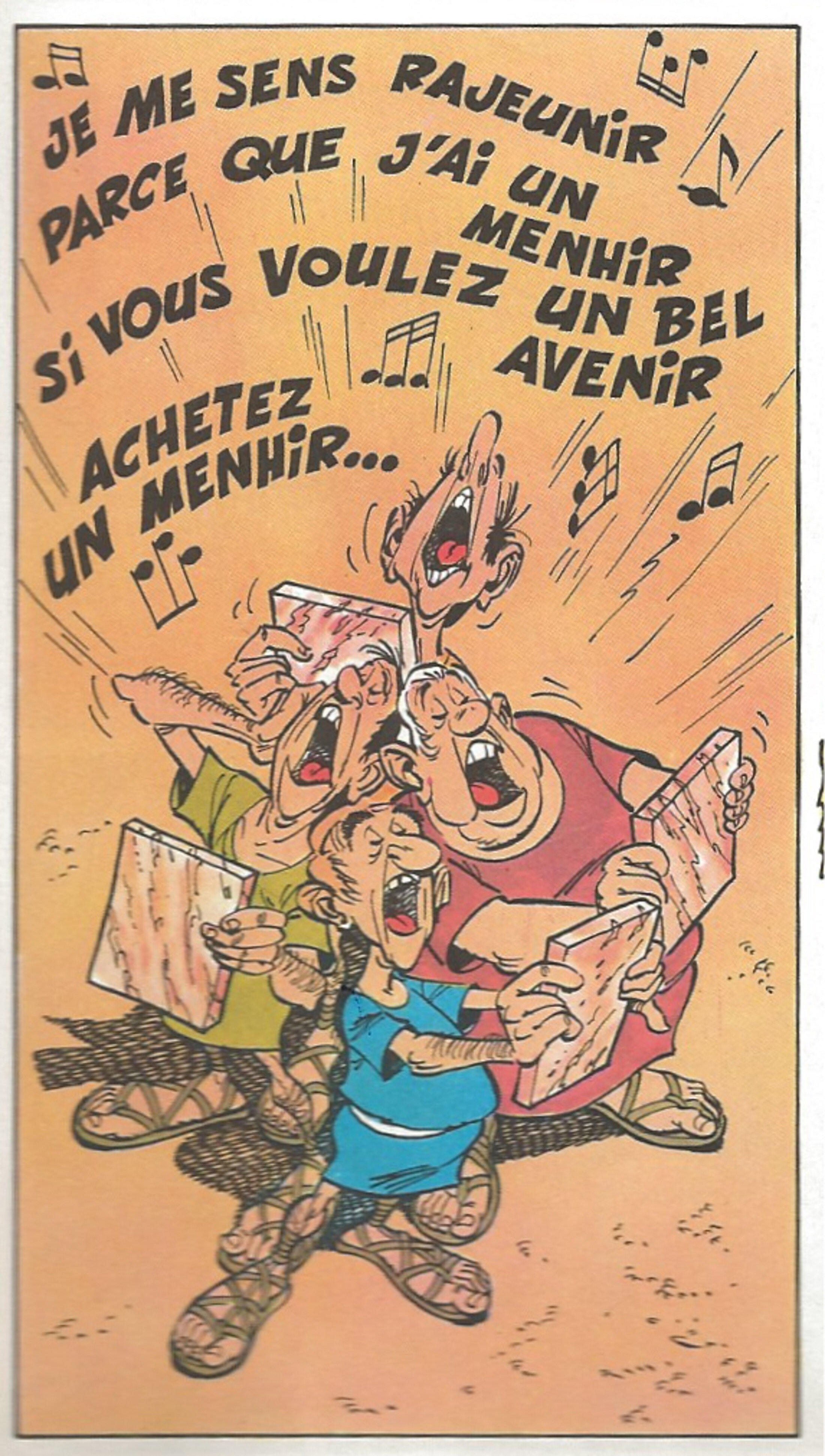Là-dessus, Uniprix, marchand ambulant, arrive au village. poussé à la production et à la distribution par Saugrenus, Obélix l’absorbe !