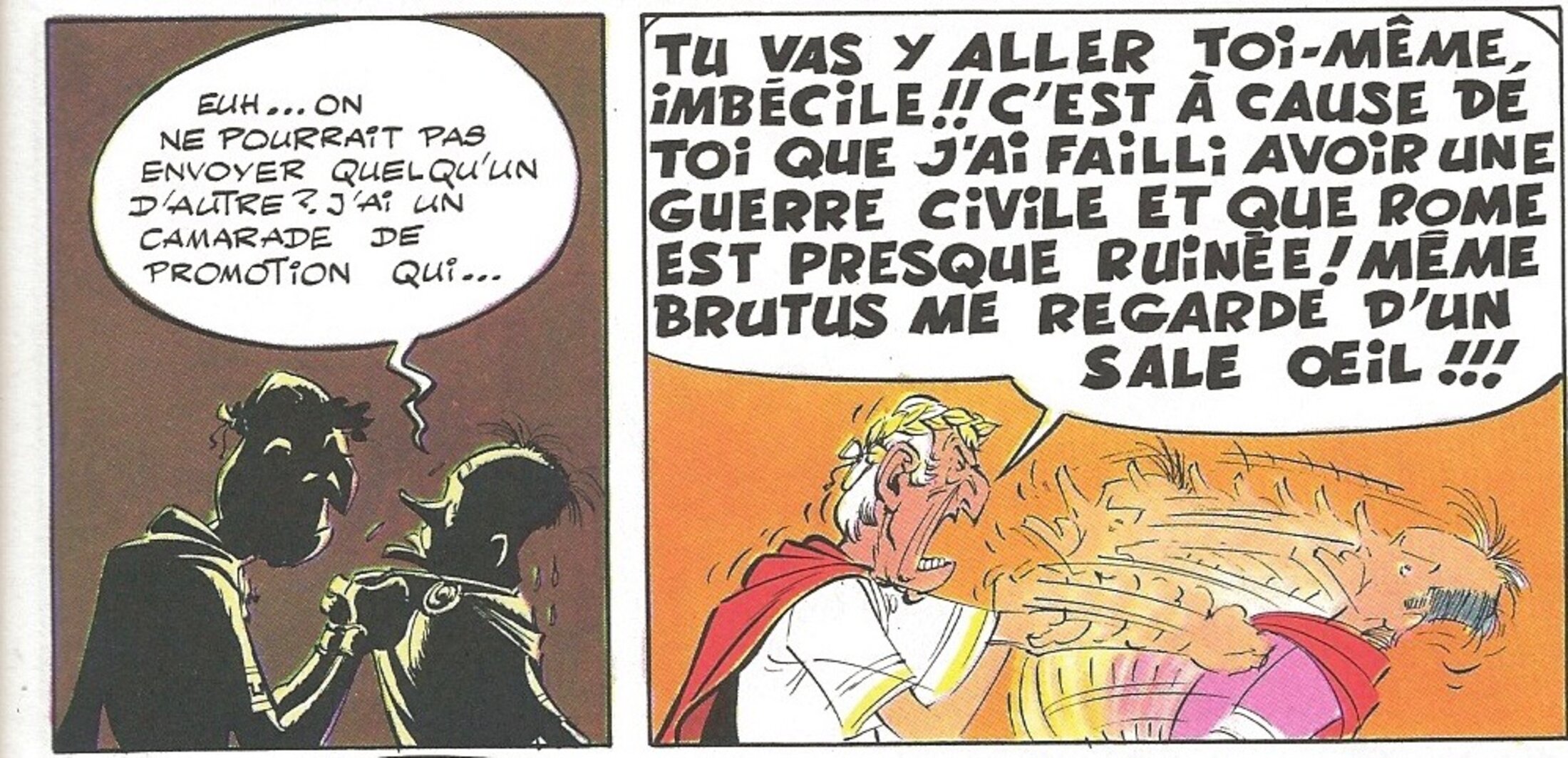 Jules César, informé de ce qu'un seul Gaulois a destroy un camp entier, se choppe un coup de blues. Il écoute ses conseillers discuter de la stratégie à suivre. Parmi toutes ces voix incompétentes, il dresse l’oreille quand il entend un discours « technocratique » : « Puisqu’ils sont forts, il faut les affaiblir. Puisqu’ils n’ont rien d’autre à faire, il faut les occuper. » C’est Caius Saugrenus qui a pris la parole.