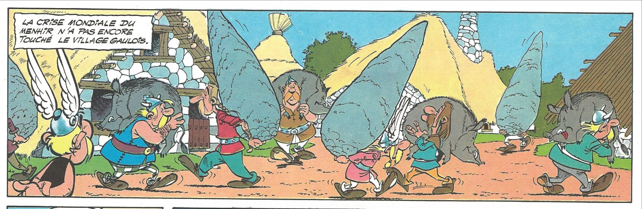 Et puis ça va être la bulle ! Des grains de sable que n’avaient pas prévus les crânes d’œuf. Artisans romains qui s’opposent à cette production étrangère. Artisans d’autres contrées qui s’y mettent. Surproduction, crise. C’est construit comme une tragédie, le coryphée était Obélix lui-même : quand Saugrenus, au tout début, lui demandait s’il en livrait beaucoup, Obélix répondait que non, parce que ça s’use pas vite. Ça se termine donc très mal pour les finances de JC.