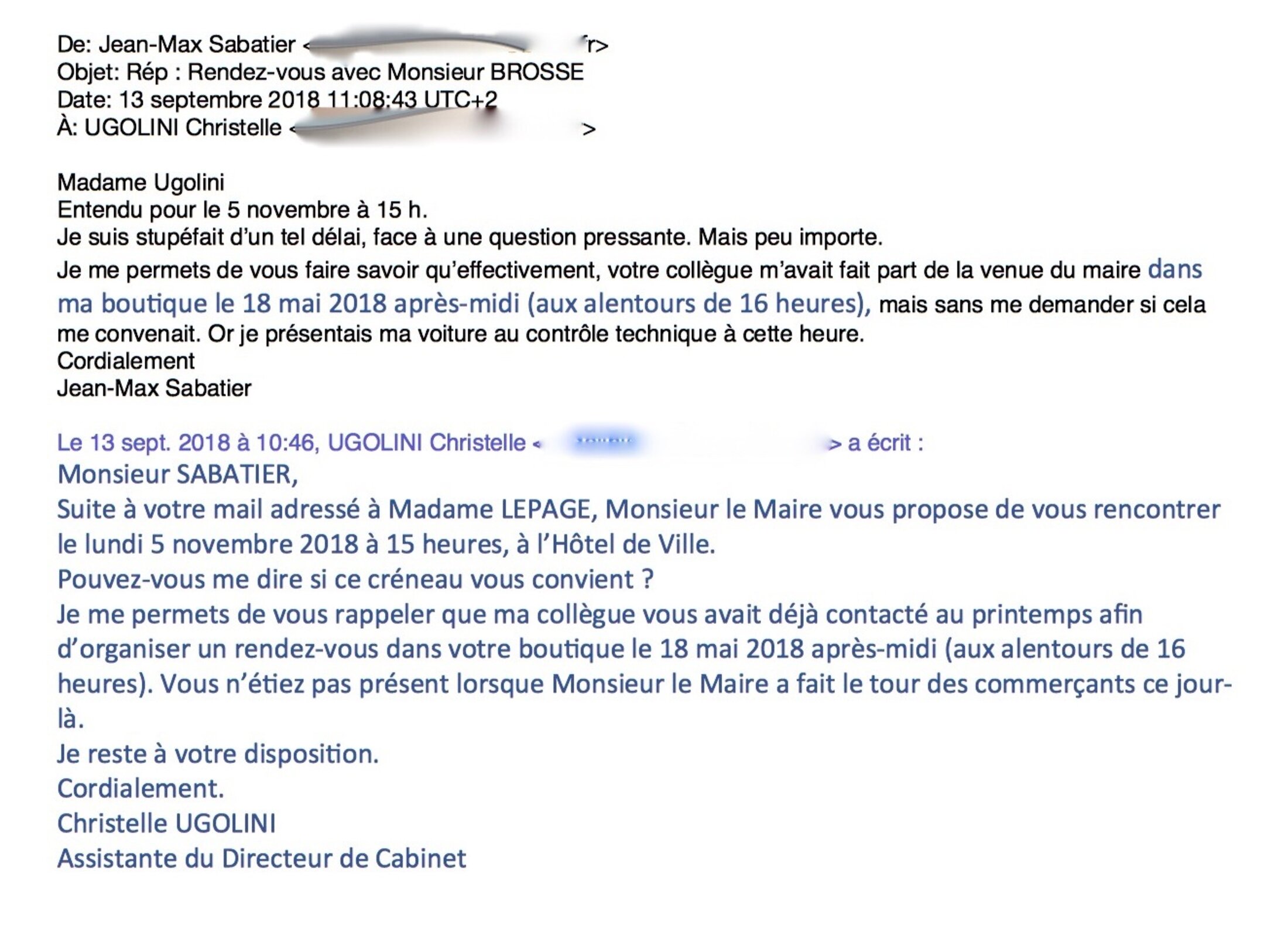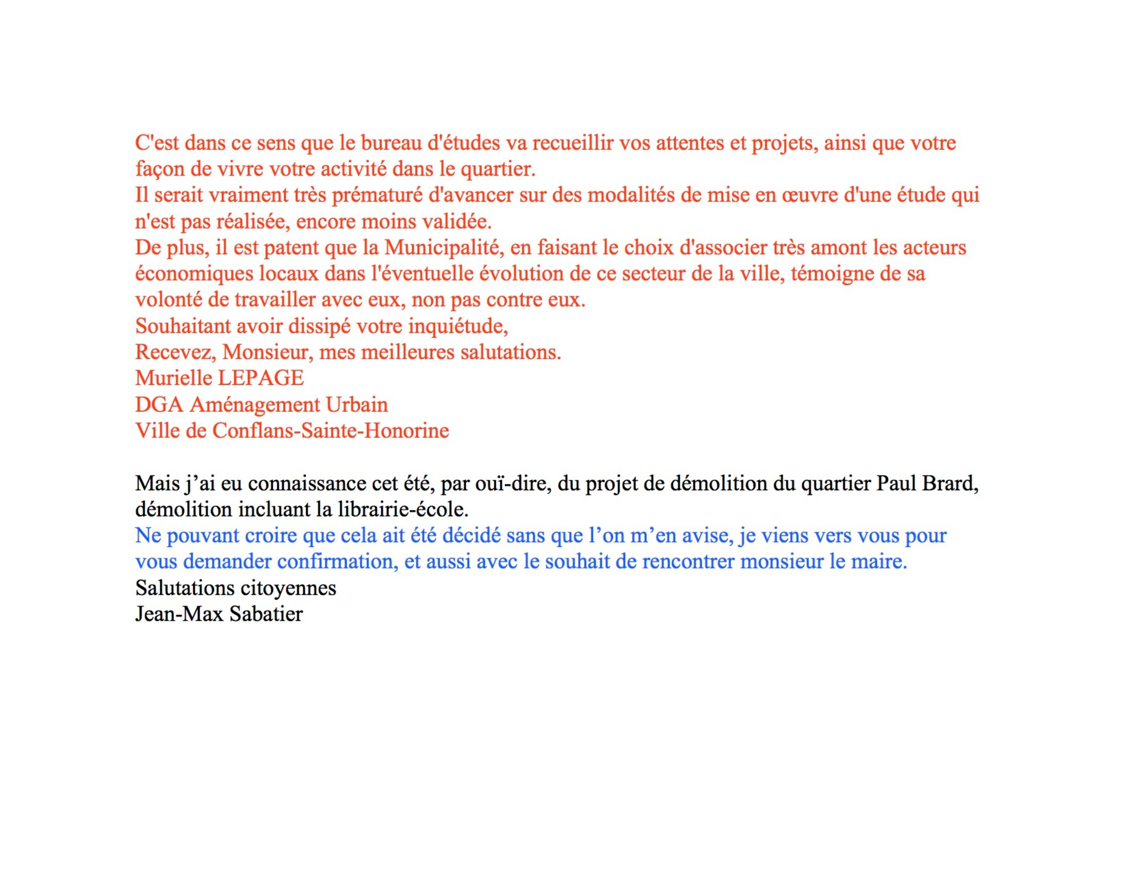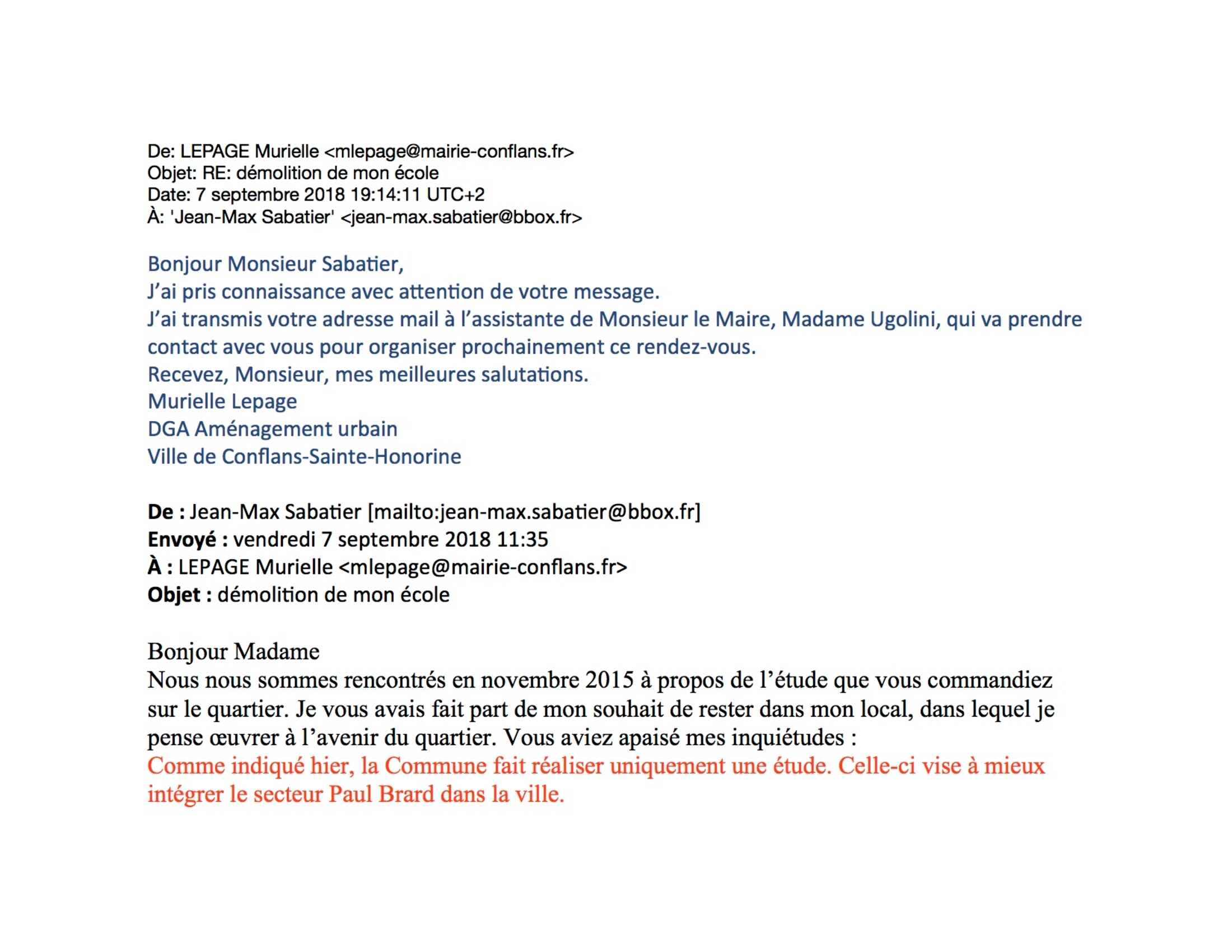 J'ai l'impression qu'on se moque de moi. Suis-je parano ? Voici quatre récents mails entre mairie et moi. Chronologie : 1) le mail bleu blanc rouge ; 2) photo du haut, texte bleu ; 3) photo du haut, texte noir.