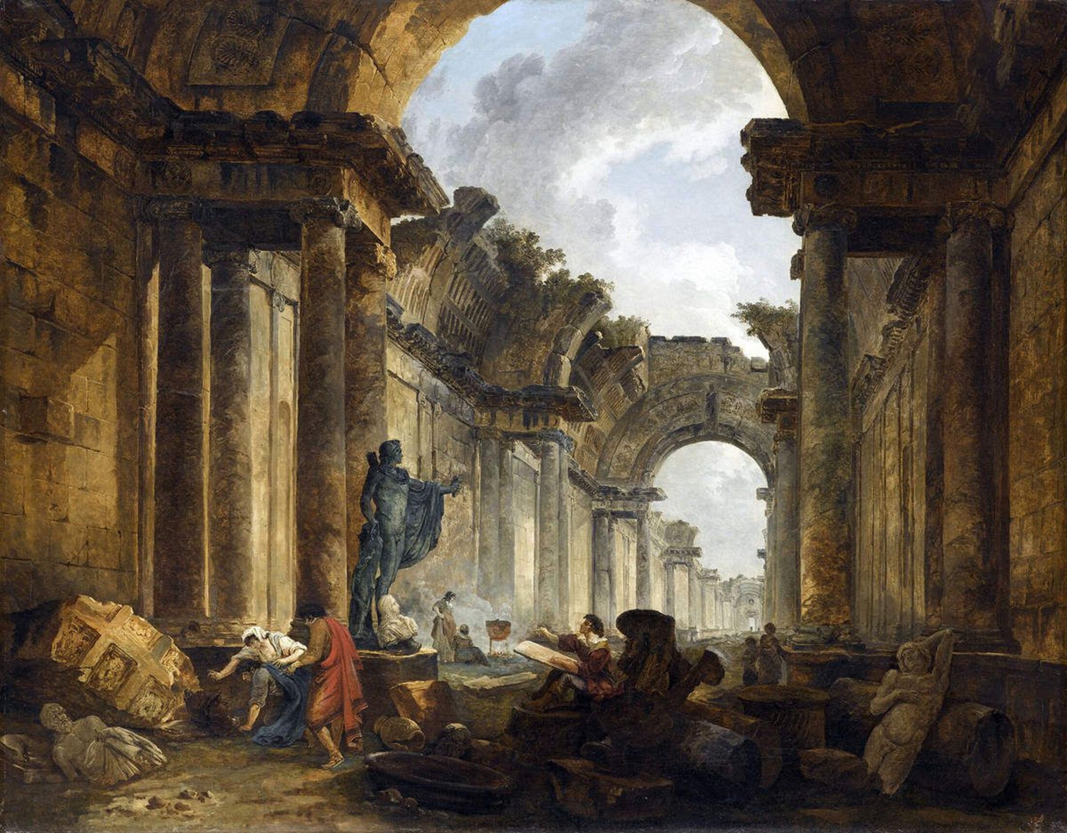 Témoins de la grandeur des civilisations anciennes, la notion même de ruines prend un sens très particulier en cette fin de XVIIIe siècle agitée. Elles inspirent un profond respect et deviennent un sujet d'étude à part entière. Les savants les archivent, les historiens s'en inspirent, les philosophes y puisent leurs sujets de réflexions. Elles doivent donc inciter les artistes à recréer la perfection classique au-delà des affres du désespoir et de la destruction. Hubert Robert exprime ainsi dans cette œuvre toute sa maîtrise du temps en conjuguant la lumière de son siècle aux stigmates de la révolution radicale, et il nous offre ici une vision imaginaire du futur en plaçant le savoir et sa transmission dans la vocation même de son musée du Louvre. Il nous propose une vertigineuse accélération du temps, que la perspective reprend, pour à la fois confronter son projet au passé, et l'ancrer dans un avenir lointain, où il incarnera à son tour cet héritage antique dont pourront se nourrir les générations futures. C'est vous, c'est nous, c'est moi, qui nous promenons dans ces ruines et ce temps des images, et si à notre tour nous venons à disparaître, le décor sera vierge de toute humanité et vidé du sens même de l'histoire. Car c'est là toute la force des œuvres d'Hubert Robert, artiste pourtant trop méconnu, que de nous confronter à ces questions fondamentales et névralgiques qui résonnent aujourd'hui à nos oreilles averties : de quel monde voulons-nous ? Et quel monde léguons-nous ?