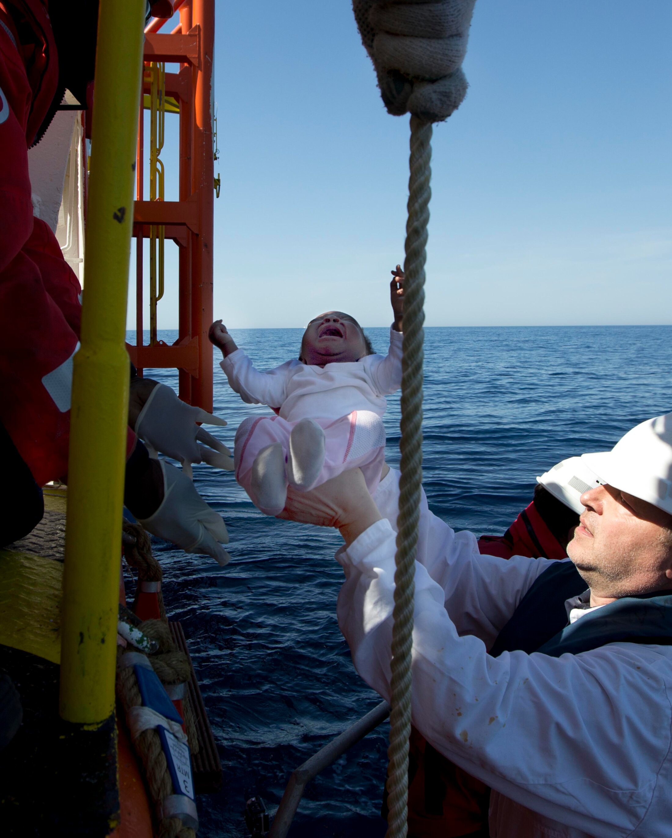 Le voilà, sa masse grise de fragile jouet de plage perdu entre deux vagues. Premier repérage en canot. Ils sont nombreux, il y a des hommes, des femmes, des gosses, des bébés. On charge 120 gilets de sauvetage. Et peu après, ils arrivent. D’abord les deux nourrissons extraits du fond du Zodiac. Et deux enfants de 2 et six ans, Erwan et Willy, de Centrafrique. Leur mère monte à bord, fait des gestes pour dire qu’on leur a tiré dessus, s’effondre. Dora, une jolie Nigériane, s’écroule elle aussi en pleurs, sans pouvoir dire un mot. Souleimane remercie le ciel par une prière à même le plancher du pont. Et il faut porter un jeune de dix-huit ans, atteint de polio, et qui a perdu ses béquilles en Libye. Certains sont plus forts, sourient, remercient comme ce groupe venu de Yaoundé au Cameroun. Mais tous sont trempés jusqu’aux os, grelottent au soleil, demandent une couverture, une bouteille d’eau, un biscuit.