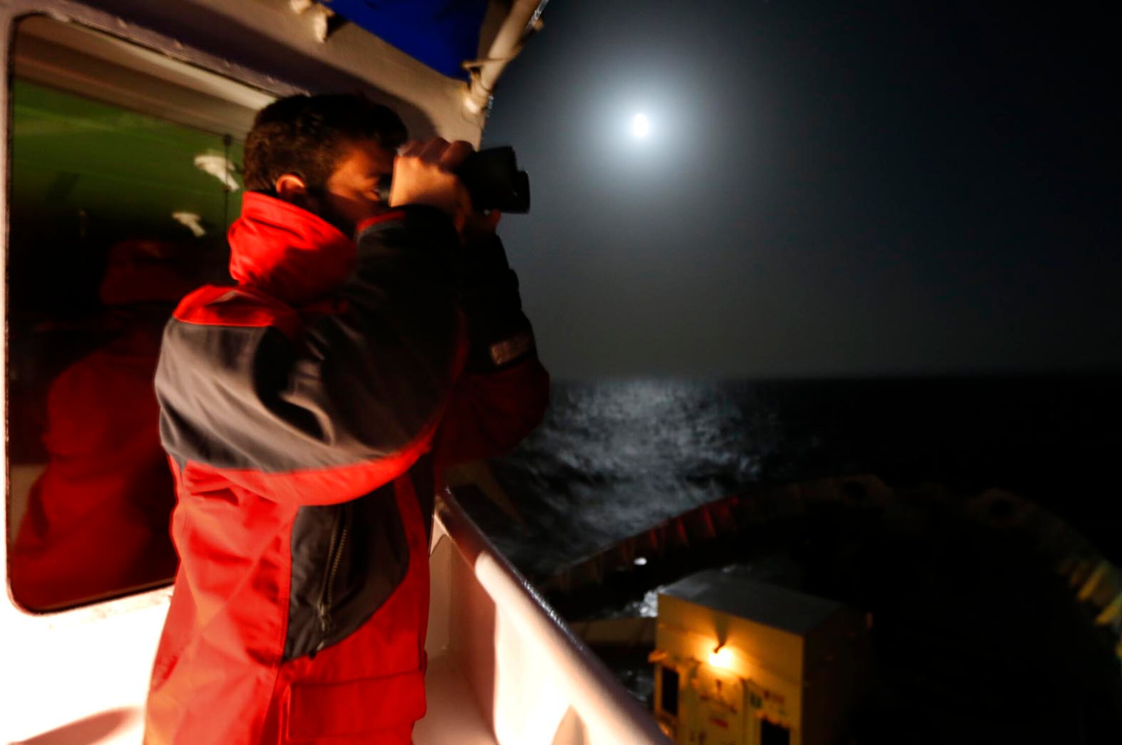 La nuit est tombée, les officiers se sont succédés sur la passerelle, les jumelles à la main, scrutant le sommet des vagues qui pouvaient engloutir et nous masquer le Zodiac. Deux heures de veille, la relève, deux heures de veille. Toute la nuit. À la lumière de la lune. « Un cargo est passé à moins de 4 kilomètres sur bâbord. Sans ces feux de navigation, je ne l’aurais pas vu » m’a dit Jean, l’officier, les yeux rougis.