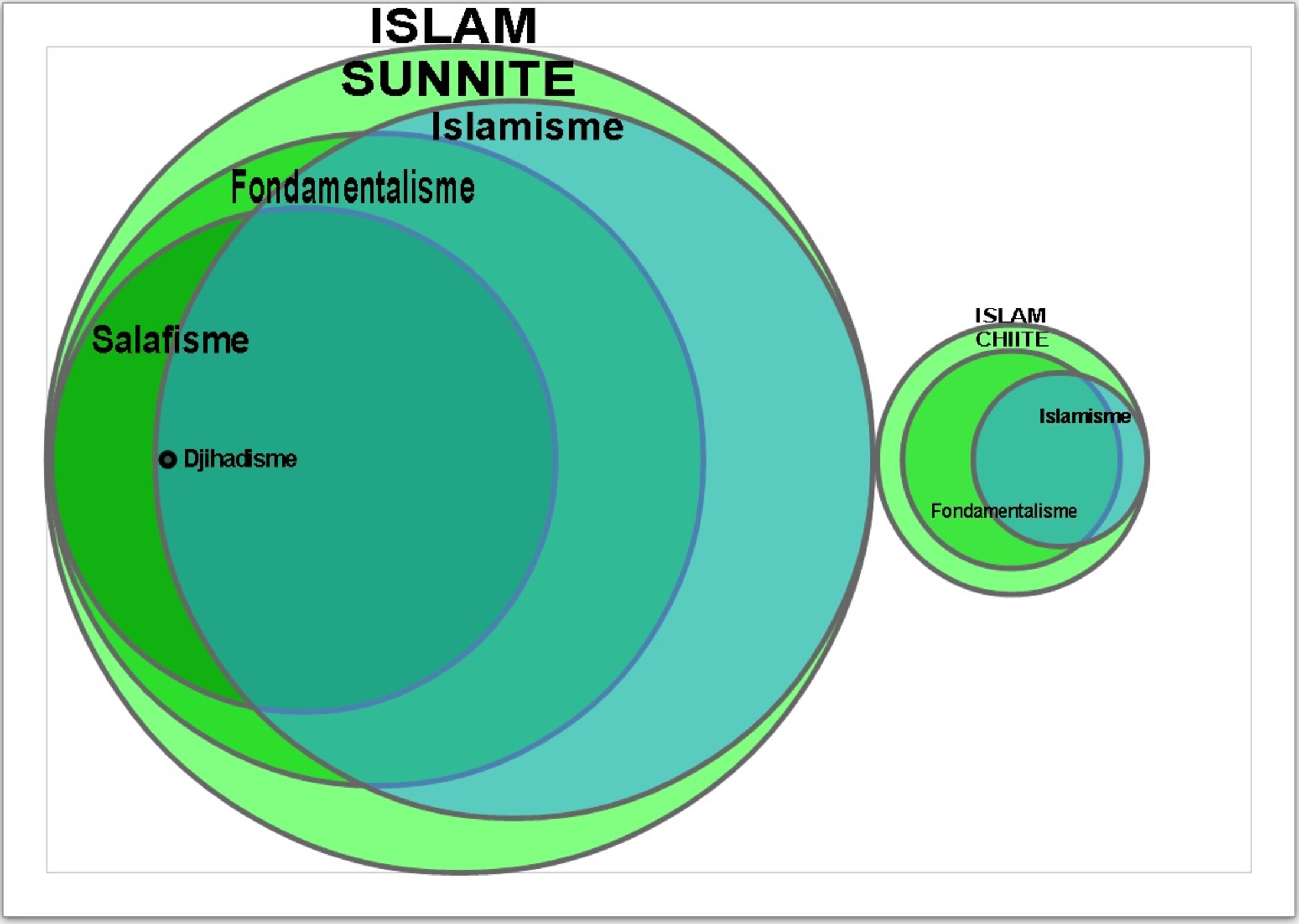 3 . Enfin, une remarque bêtement géométrique : l'emploi de la figure particulière qu'est le cercle ne permet toujours de réaliser les proportions d'intersections qu'on penserait souhaitables. Ainsi, les intersections entre d'une part l'islamisme et d'autre part le fondamentalisme et le salafisme sont plutôt surproportionnées.