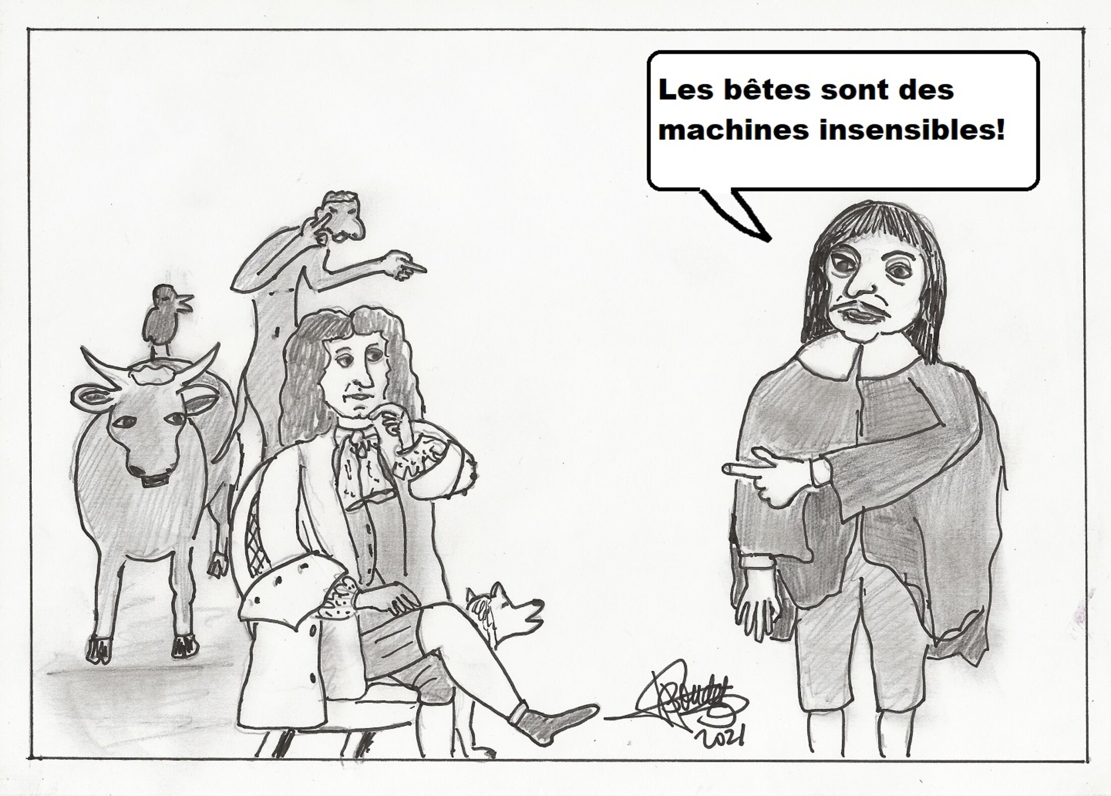 Pour le savant Descartes, l’animal n’a ni âme, ni raison, pas de pensée ni de sentiments. Il réagit par automatisme, comme une mécanique ou une machine. Ces philosophes cartésiens estiment que l’être humain possède la pensée, le langage et qu’il a une âme et un raisonnement. Comme, selon eux, les animaux n’ont pas de conscience, ils ne souffrent pas et on peut en faire ce que l’on veut. Si les animaux avaient une âme, cela remettrait en cause Dieu et la religion car il a créé l’homme à son image. C’est la parole qui détermine la conscience. Descartes réfute le fait que les animaux puissent réaliser des actions réfléchies et qu’ils ressembleraient par-là aux êtres humains.