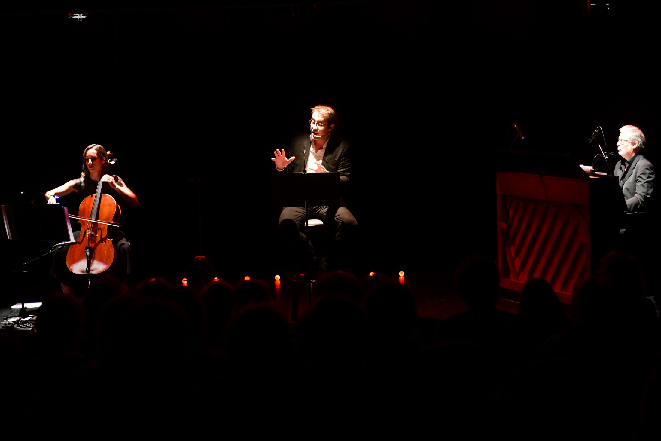 Le comédien ne chante pas. Il laisse au spectateur la liberté de fredonner en silence, dans sa solitude intérieure. Les textes/poèmes sont récités avec tendresse, avec énergie parfois. La mélodie suit son propre chemin, à côté. Le piano de François Bettencourt rythme, apaise ou stimule les sentiments qui ne cessent de naître, parfois de la seule évocation des premières notes d’une chanson. Le violoncelle de Julie Sévilla-Fraysse précède la parole, la renforce, la relaie. Il plonge le spectateur dans un monde de sensations. Puis, de temps en temps, le rythme des mots et des instruments s’accélère, envahissant tout l’espace de la scène et de la salle.