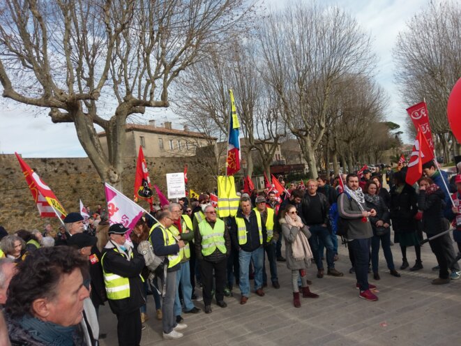 Après la manifestation du jeudi 9 janvier dernier, nouvelle mobilisation contre le projet de réforme des retraites à l'appel de l'intersyndicale (CGT, FO, FSU) ce samedi matin 11 janvier à Carcassonne. Les Gilets Jaunes de différentes villes de l'Aude étaient au rendez-vous.