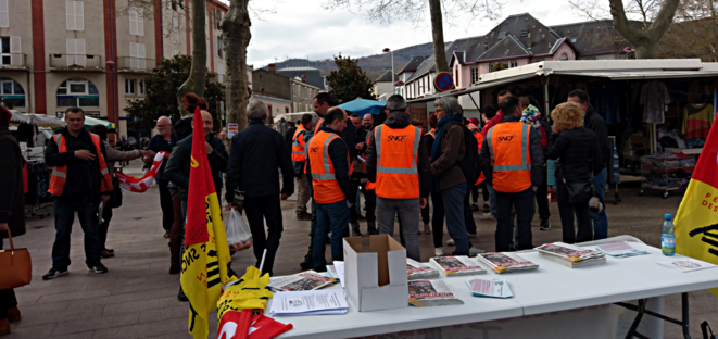 Lundi dernier, les cheminot-e-s avaient décidé lors de leur Assemblée Générale à Pamiers de venir au marché de Foix à la rencontre du public. Plusieurs dizaines d'agent-e-s de la SNCF étaient donc venue-e-s ce vendredi matin 13 avril sur les Allées de Villote à l'appel des syndicats CGT Cheminots et Sud Rail.