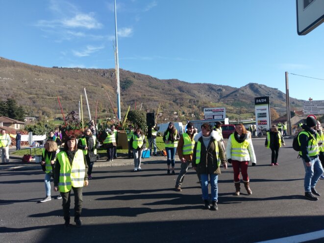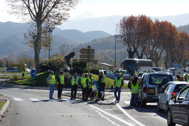 Le mouvement des "Gilets jaunes" a surgi dans l'Hexagone en opposition à la hausse des taxes sur les carburants. Mais ces derniers jours, de nombreuses autres revendications sont apparues comme le rétablissement de l'ISF ou encore la défense des services publics. Certain-e-s demandent aussi la démission du président-roi Macron. Ce 24 novembre, blocage dans la ville de Foix en Ariège, Occitanie.