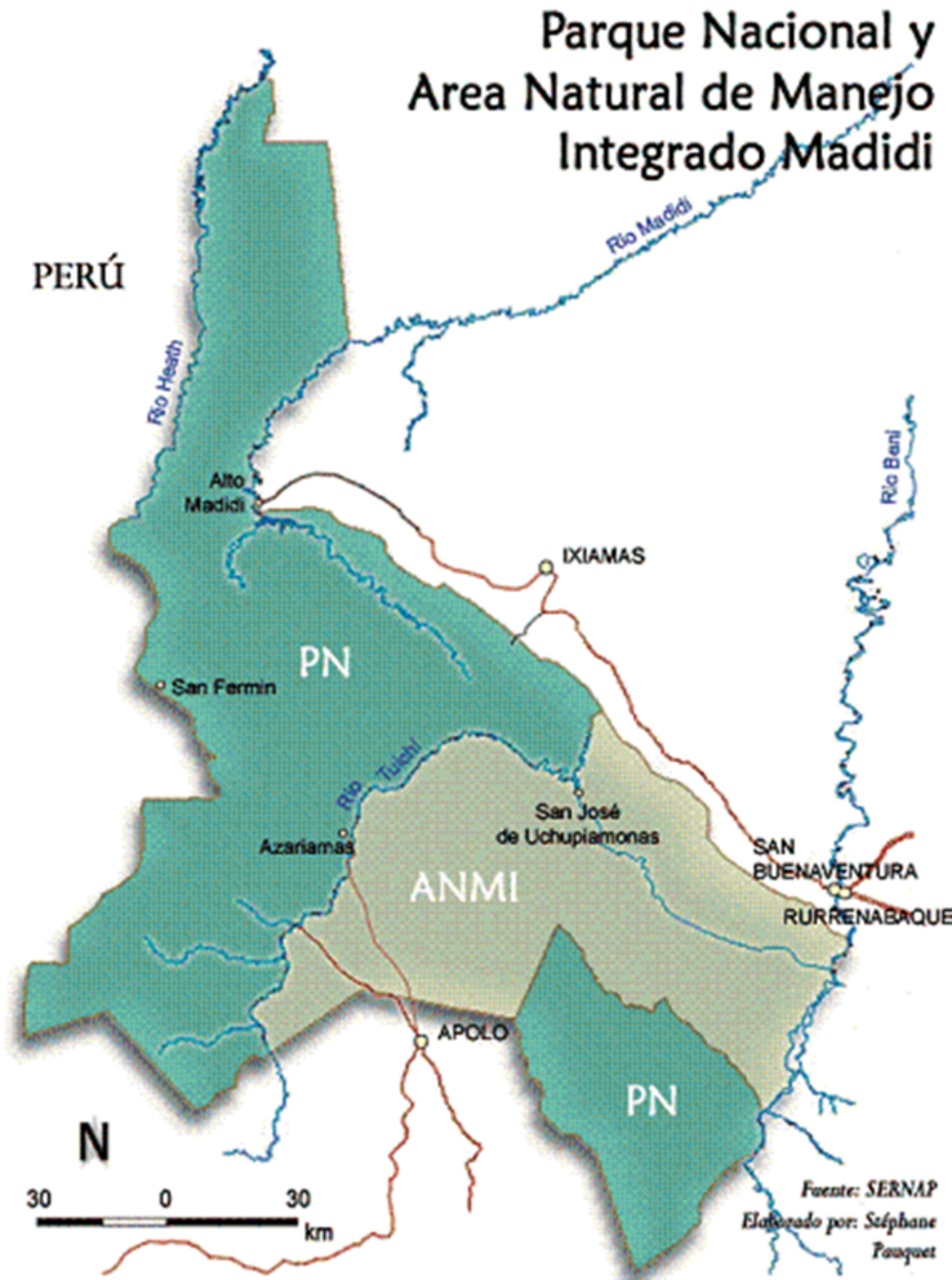 [6] Le PN-ANMI Madidi fut créé par le décret nº24.123 du21 septembre1995. Il a une superficie de 1.895.750 ha. C’est l’aire protégée la plus importante de Bolivie.Elle s’étage de 6000 à 200 mètres d’altitude. On y a dénombré 1000 espèces d’oiseaux, 300 de mammífères, 200 d’amphibiens, plus de 192 de poissons, et 6.000 espèces de plantes, http://www.fuhem.es/media/ecosocial/Image/culturambiente/fichas/BOLIVIA_explotacion%20turistica_n8.pdf