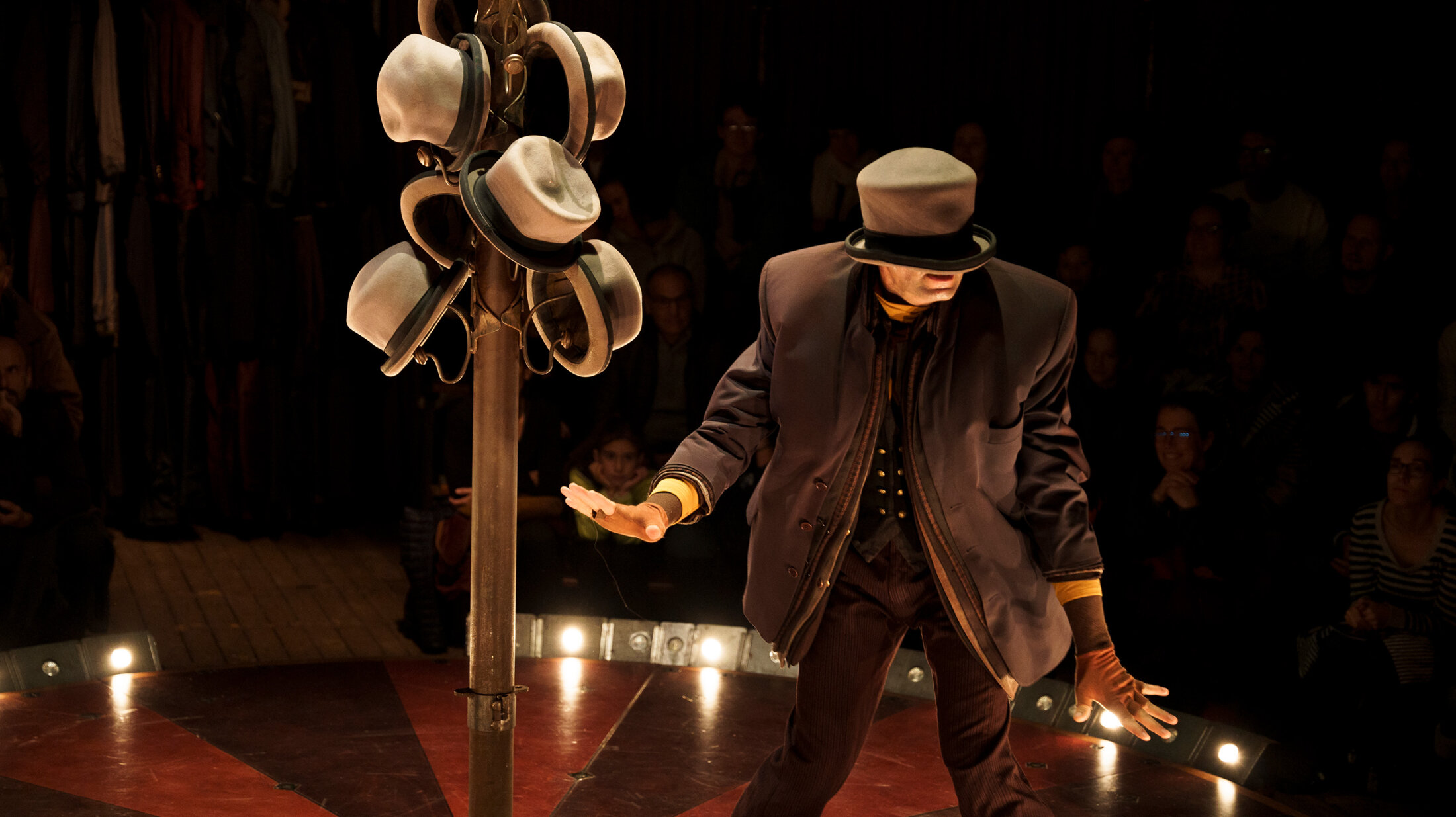 Décrochez-moi-ça est le beau titre du spectacle. L’étymologie nous apprend que l’expression désignait naguère un soulier ou un chapeau d’occasion avant que l’expression ne désigne une friperie. Rien de neuf, en effet, sauf leur constante inventivité. Elsa et Laurent donnent aussi à cette expression un autre sens sans doute très ancien, celui de crochets auxquels accrocher des chapeaux ou des manteaux. De fait, il y a tout une série de chapeaux qui, un à un, sont lancés et s’accrochent sur les crochets accrochés eux-mêmes sur le poteau central de la petite piste A la fin, les artistes sont là mais, bientôt, ils disparaissent derrière une forêt circulaire de miroirs. Bref ils nous en mettent plein la vue. Et donc, chapo !