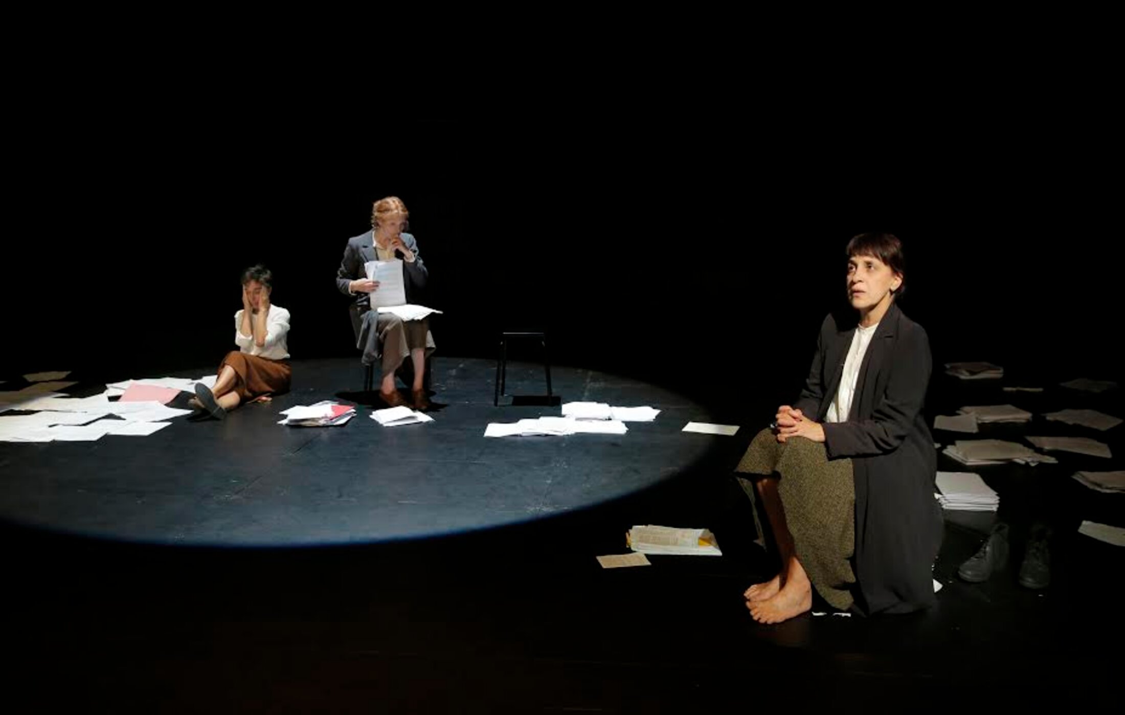 Les livres encombrent la petite table autour de laquelle, éclairées par des lampes de poche, conversent Lydia Tchoukovskaïa (Johanna Korthals Altes) et Anna Akhmatova (Isabelle Lafon). Les feuilles du Journal (1915-1941) de Virginia Woolf jonchent le sol de Let me try, feuilles que dévorent, seules ou ensemble, les trois actrices comme au hasard (les deux suscitées et Marie Piemontese). Un pupitre est dressé devant l’actrice unique (Isabelle Lafon) qui, accompagnée par un batteur, swingue dans les pages de L’Opoponax, premier roman de Monique Wittig qui lui valut d’obtenir le prix Médicis en 1964 accordé par un jury où siégeaient alors des écrivains comme Claude Simon ou Nathalie Sarraute.