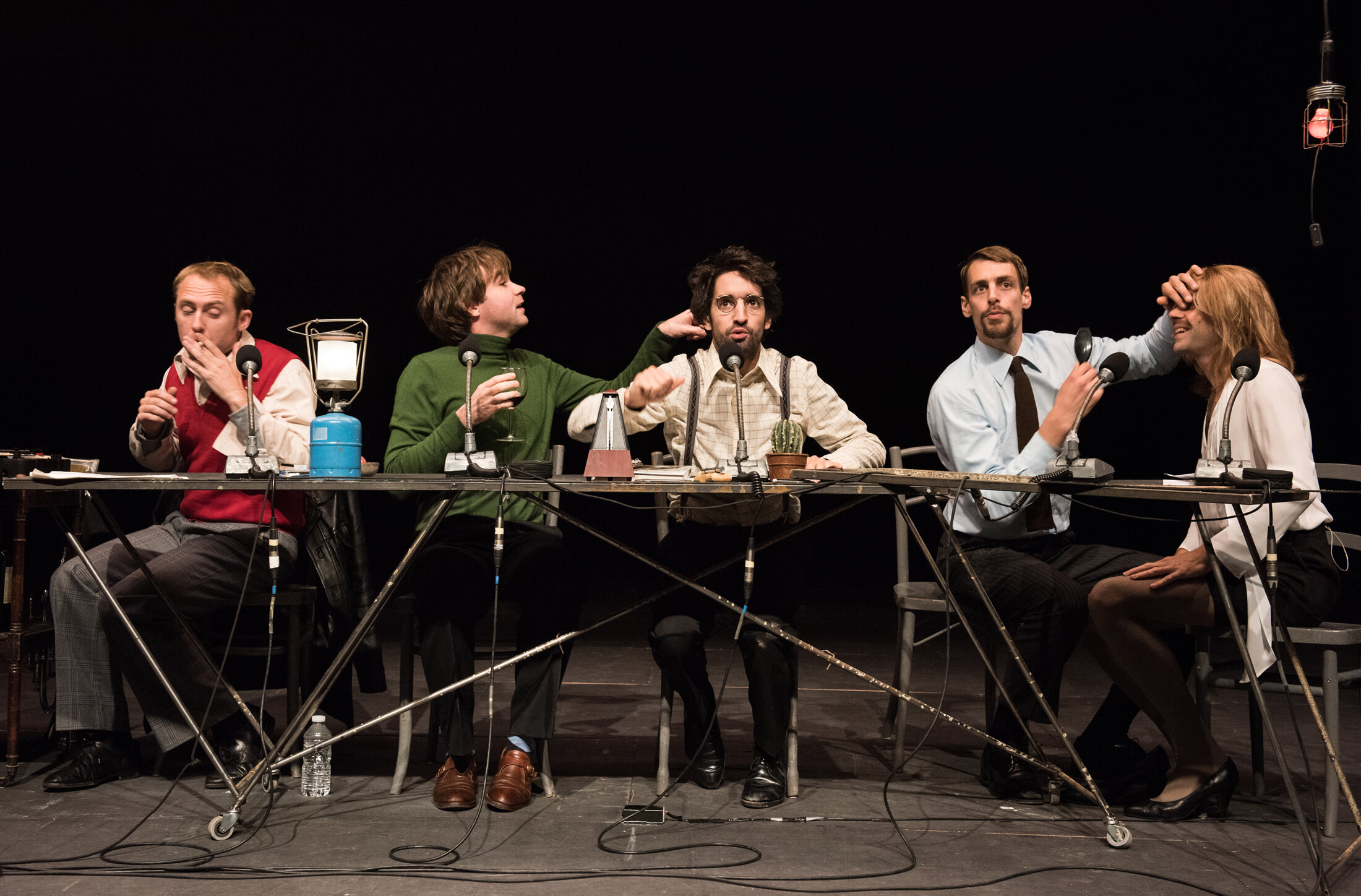 Le Théâtre de la Bastille héberge ces sans auteur, sans pièce, sans metteur en scène, ces sans domicile fixe de l’écriture scénique. Tout commence donc à la table comme souvent, mais comme c’est aussi souvent le cas des enregistrements publics d’émissions de radio. Sauf que le public que nous sommes n’est pas censé être celui des auditeurs des années 70, lesquels interviennent par télex (!), en particulier une certaine auditrice de province dont le nom rappelle celui d’une écrivaine et qui proteste contre ces animateurs qui fument dans le studio !
