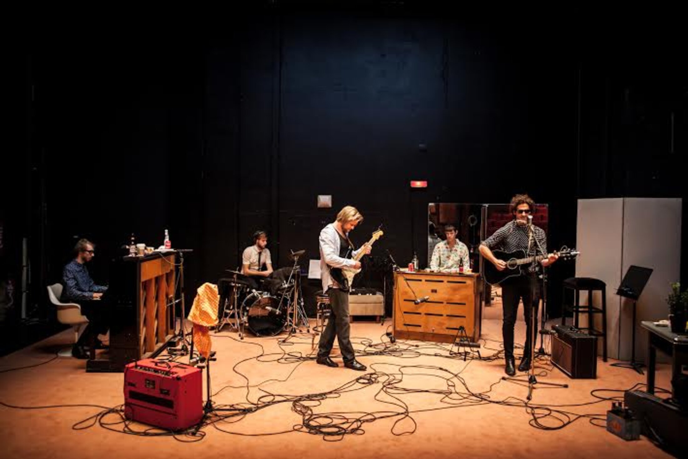 Le décor est donc le fatras d’un studio d’enregistrement un peu à l’étroit sur la petite scène souterraine du Studio de la Comédie française. La force de ce spectacle, c’est justement de ne pas en être un mais de montrer comment cette séance d’enregistrement est, comme la plupart du temps, faite de bric et de broc, de moments d’attente, de ratages, d’incertitudes, de doutes, de tâtonnement, de vide. Ils ne savent pas trop où ils vont mais, de prise en prise, on y va. Rien n’est sûr, pas même la durée de la chanson qui explosera les normes. Dylan est à un tournant, cela n’est pas dit, mais on le sent. Ce qui est fascinant, c’est d’assister justement au processus hasardeux de la création qui fait son miel de tout. Jouant le rôle de Dylan et même s’identifiant à lui, Sébastien Pouderoux est stupéfiant.