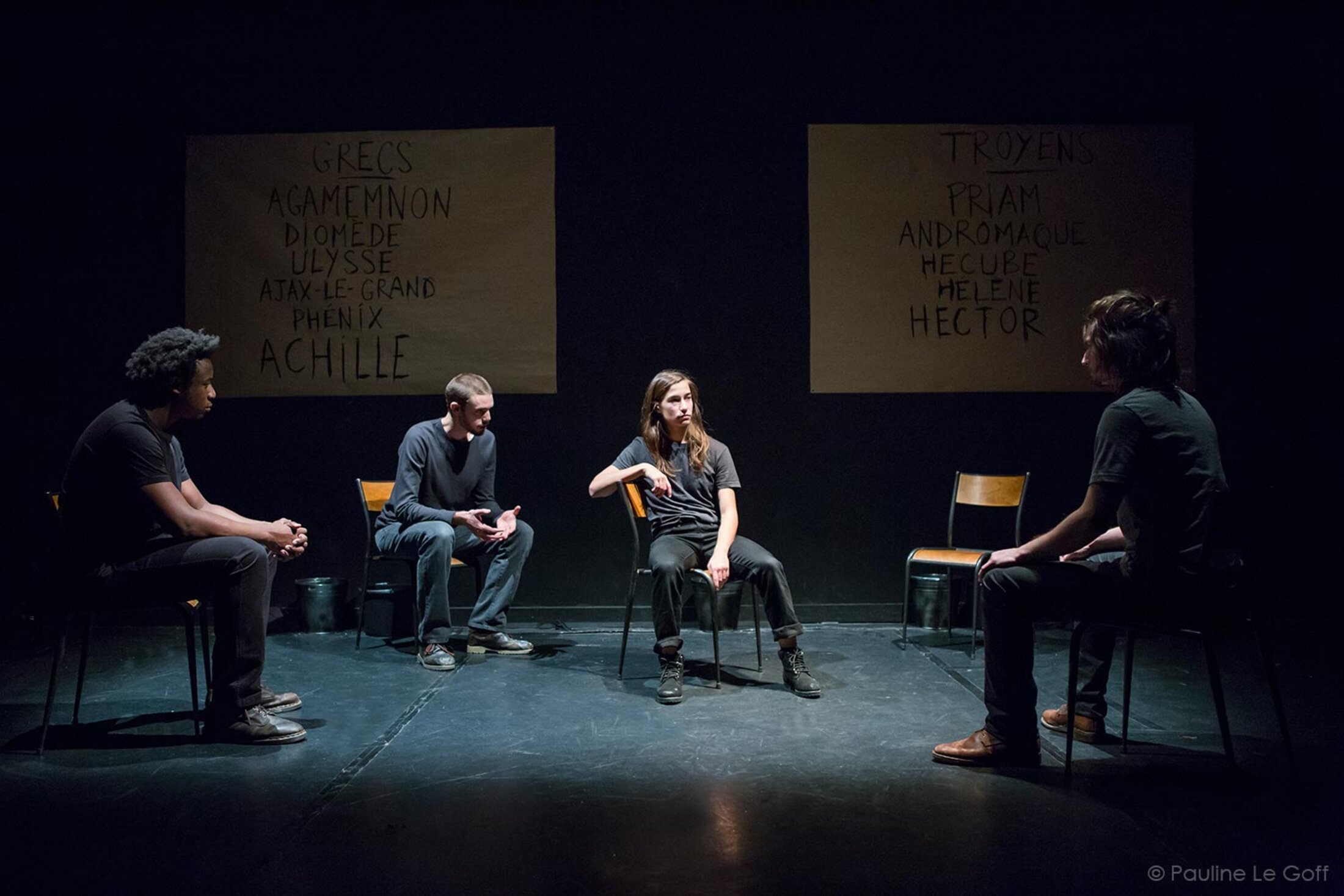 Dans l’adaptation scénique proposée par Pauline Bayle (qui signe adaptation, décor et mise en scène), Thétis pose la même question. Achille répond : « Agamemnon me traite/comme un moins-que- rien/une fripouille, un scélérat, une crapule./Moi/le meilleur de tous les Grecs./Moi/qui me bats pour lui depuis neuf ans./Lui, il me prend mon honneur/et se mouche dedans/je voudrais qu’il crève comme un chien. » La réponse est plus condensée que chez Homère. D’une part parce que nous venons d’être témoins de l’affrontement entre Achille et Agamemnon qui s’est déroulé, parmi nous (spectateurs) dans le hall du théâtre et qu’il est donc inutile de tout réitérer. D’autre part, porter à la scène l’Iliade en un spectacle d’une heure trente suppose une condensation généralisée du propos.