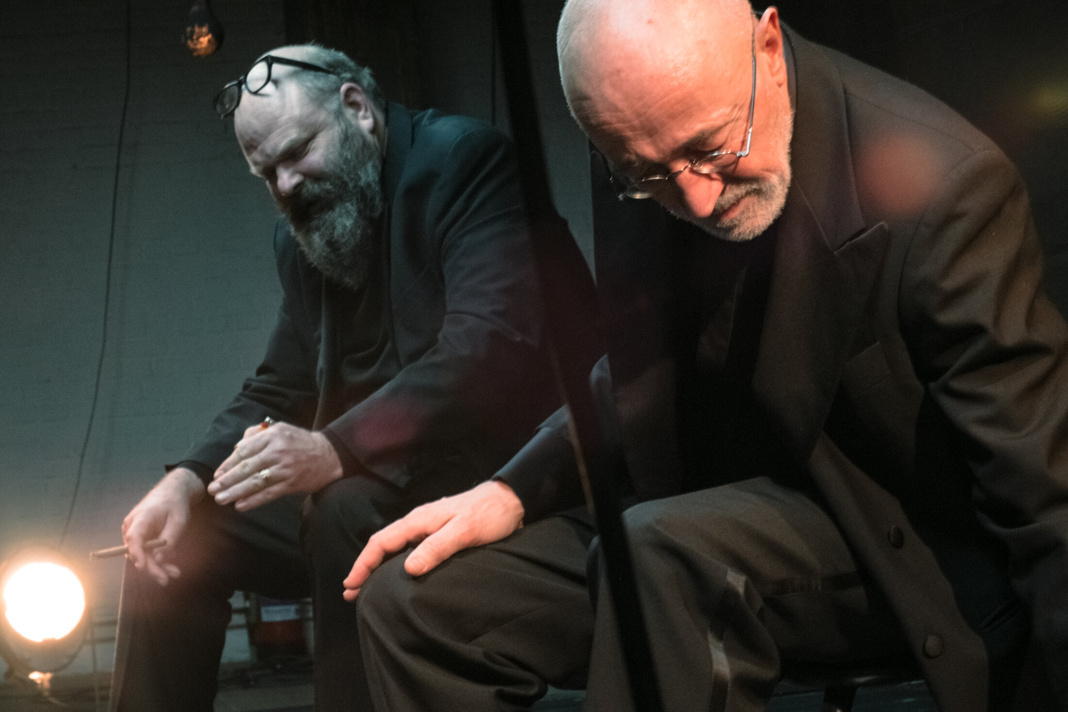 Ils sont déjà là, avant même l’entrée du public, assis sur leur chaise, à leurs pieds quelques cannettes de bière (qu’ils ouvriront pour leur pschiiit mais ne boiront pas) et des petites bouteilles d’eau en plastique (qu’ils décalotteront et boiront de ci de là). L’un (Damiaan), corpulent, le crâne dégarni mais la barbe généreuse, l’autre (Matthias), plutôt maigre, le crâne rasé. L’un jovial comme à son habitude, l’autre plus précautionneux.