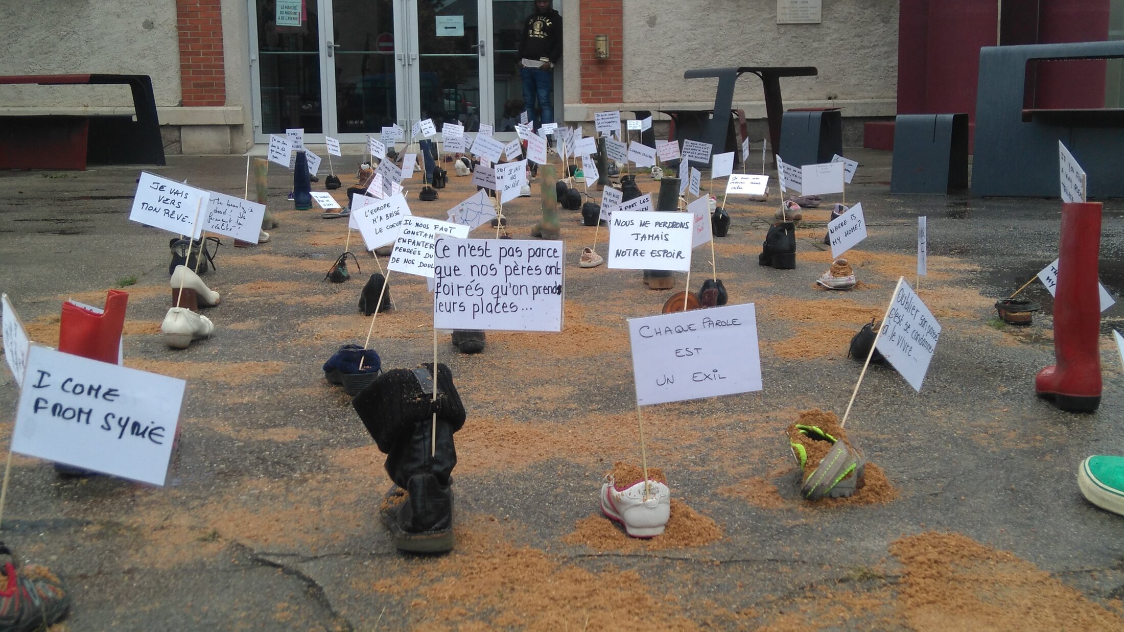 Alors quand Nadège Prugnard, une des nombreuses artistes associées des Ilets, a déployé dans la ville une installation matérialisant la situation des migrants, cela n’est pas passé inaperçu. Devant le Théâtre des Ilets, mais surtout tout au long de la grande avenue Marx Dormoy qui part de la gare pour rejoindre le centre ville, l’allée centrale est occupée par une longue file de chaussures, chacune lestée de sable. Un petit drapeau blanc est planté dans chaque godillot passablement usagé, sur lequel on peut lire des choses comme : « Je suis Ayman », « Je m’appelle Jérusalem et toute ma famille est morte sur la route d’Atbara qui mène à Khartoum », « Avant j’étais gardien de chèvres dans le Kurdistan », « Où aller ? », « Mis à part les sanglots rien ne contracte ma gorge », « No border »... Certains pans de cette installation ont été nuitamment saccagés avec un auto-collant pour guise de signature : « pour le Renouveau français ». Aux élections présidentielles, Marine Le Pen n’était qu’en quatrième position mais avec tout de même plus de 18 % des voix.