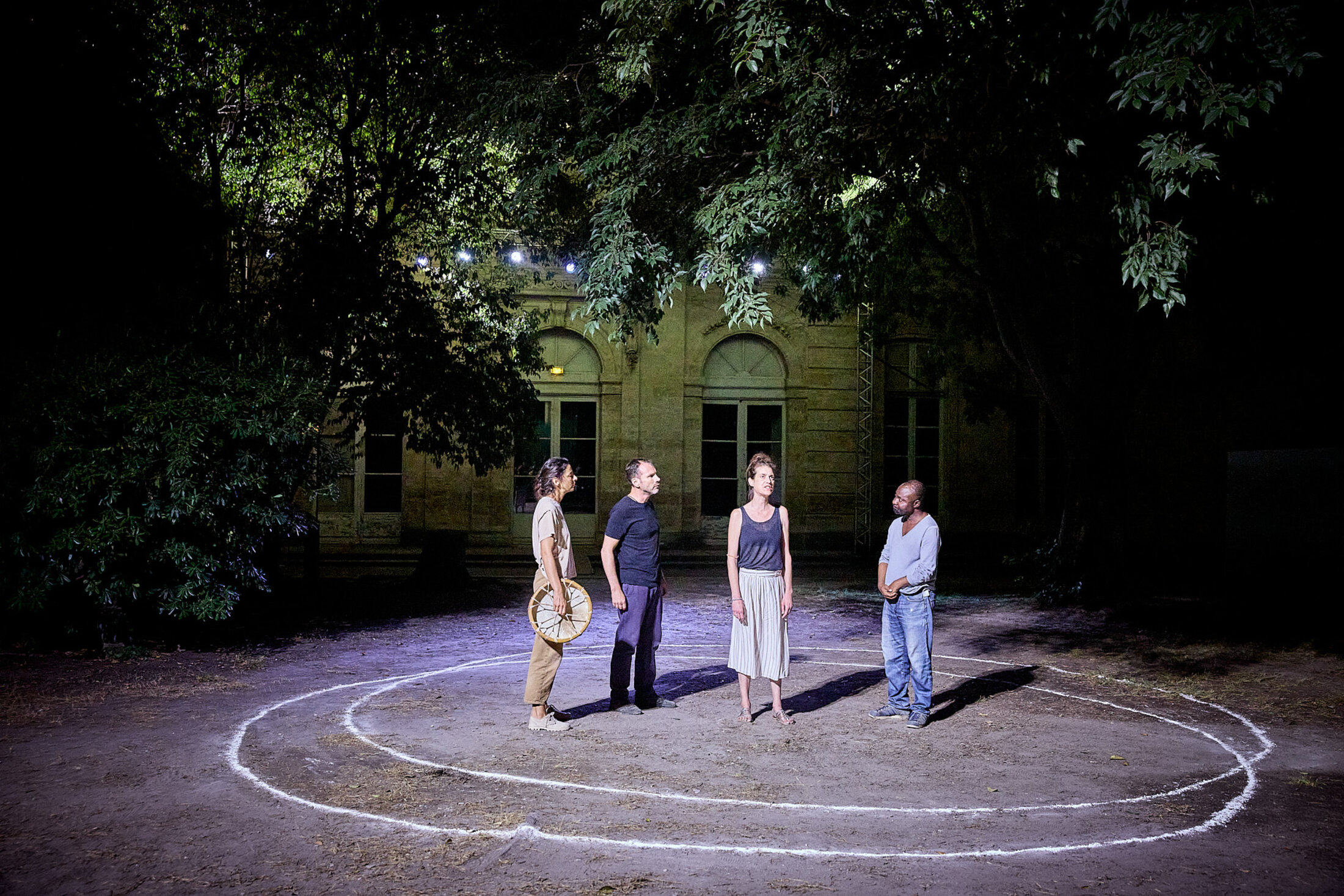 Dans le jardin de la rue de Mons, les arbres semblent avoir pris d’ampleur depuis l’été dernier. Sur le sol, un double cercle tracé à la craie devant l’unique gradin des spectateurs. Autour tournent les quatre « interprètes professionnels rencontrés lors de l’atelier libre mené à Avignon depuis 2023 par Gwenaël Morin » (lequel signe adaptation, mise en scène et scénographie) : Jeanne Bred, Fabrice Lebert, Gilféry Ngamboulou et Julie Palmier. Les quatre sont vaillants, volontaires, mais la pièce, au phrasé difficile, demanderait une distribution ayant plus d’expérience dans les mollet et et les gosiers pour porter haut la langue d’Eschyle. En revanche, on les auraient bien vus s’éclater dans quelque uns des récits que Shéhérazade raconte au sultan toute la nuit et le tient en haleine pour ne pas qu’il l’a tue au petit matin.