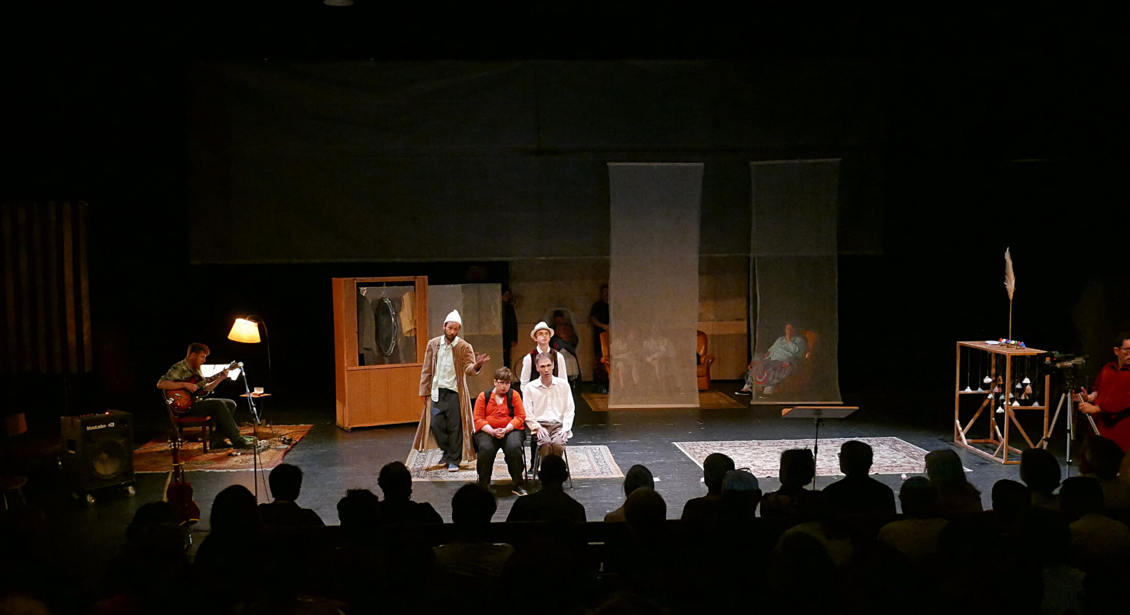 Tous n’ont pas le pouvoir d’invention langagière de Clément Villa et de Stéphane Juglet. Certains ont du mal à trouver le chemin des mots. Qu’importe. Celui-ci brandit une roue solaire, celle-là une mini guitare verte. Le spectacle Déroulé d’amours abricotinées est une promenade où comme des oiseaux les mots et les corps, même entravés ou difficultueux, se posent sur des fils, des clochettes, des tentures, un canapé ou un portique. Et volent vers nous. Accompagnés par la guitare électrique live de Pierrick Lefranc.