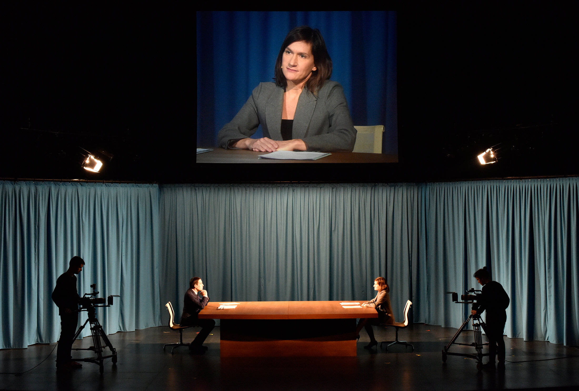 Un spectacle filmé en direct qui allait se dérouler sur la grande scène du théâtre, entre deux acteurs, au sens large et précis du terme, de part et d’autre d’une table longue de trois mètres. Pas n’importe quel débat, ni n’importe quel rituel. Mais celui opposant les deux candidat.e.s étant arrivé.e.s en tête au premier tour des élections présidentielles, de 1974 (Giscard contre François Mitterrand) à 2017 (Emmanuel Macron contre Marine Le Pen), soit sept débats. C’est un rite télévisé relativement jeune, avec des règles voulues strictes en ces temps de contrôle (d’images, mais pas seulement) que le public du théâtre de la Cité internationale observe sur un écran et de visu depuis la grande salle.