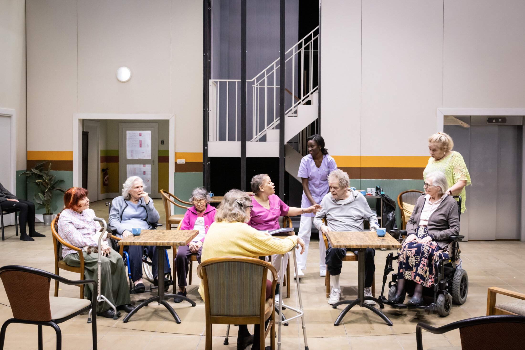 On peut penser que le premier acte qui se passe dans la maison où la mère (Catherine Vinatier) veille sur sa propre mère (Mare-Christine Barrault) entourée de ses deux enfants est celui qui est, pour Zeldin le plus intime. Il est, pour nous. le plus convenu Le spectacle prend ses aises et son ampleur dès lors que la grand-mère (après une chute) entre dans un l’EHPAD (où elle pensait ne jamais aller) et y restera jusqu’à sa mort au dernier acte, entourée de sa famille des pensionnaires qui lui ressemblent plus ou moins, et d’un personnel plus jeune comme l’aide soignante ( Nicole Dogué) ou l’auxiliaire de vie (Karidja Tourré) dévoués. Ici pas de maltraitances et de mépris comme un livre récent les dénonce dans les EHPAD luxueux ou pas du groupe Orpea.