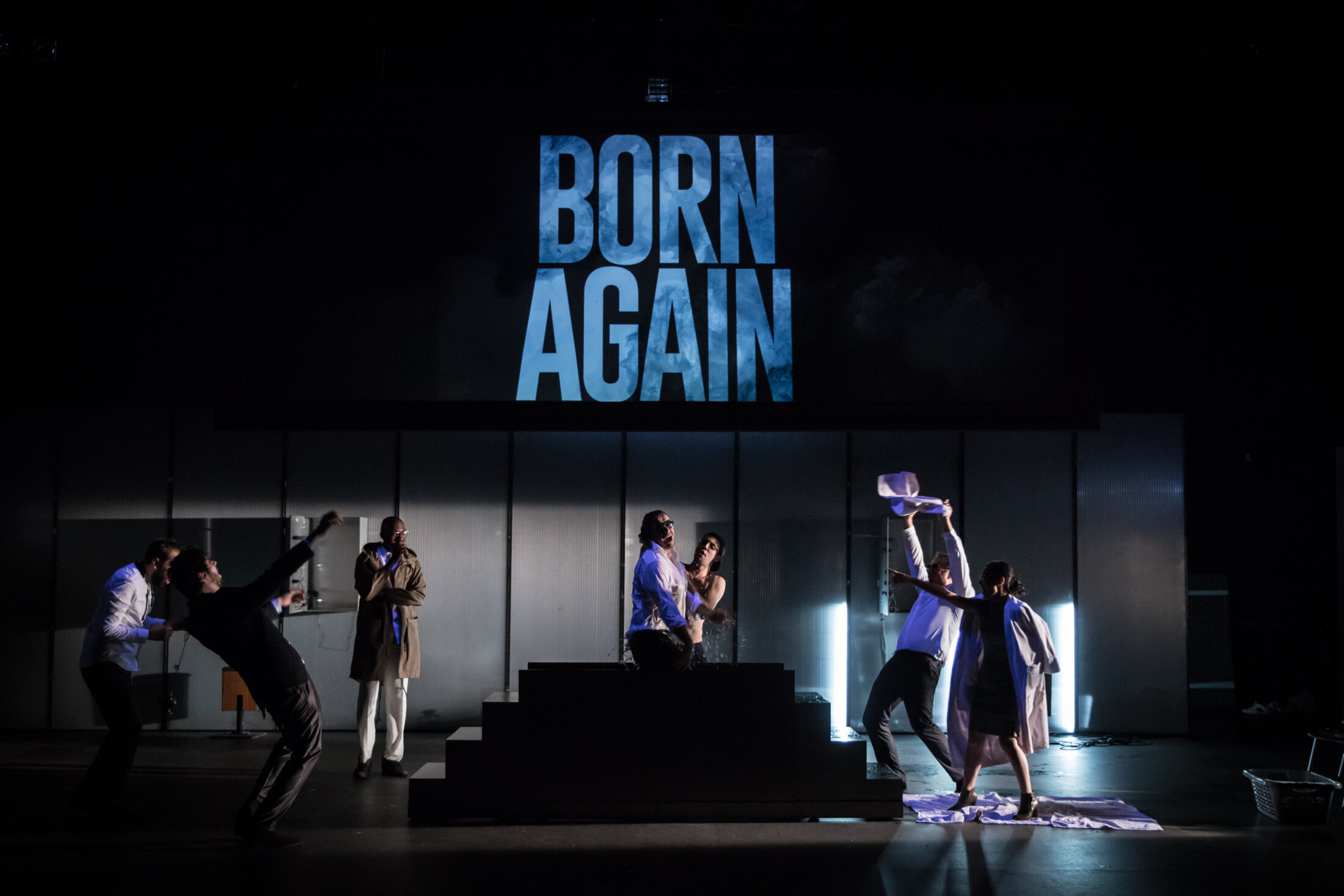 Nombre de pièces de théâtre nous ont appris à scruter le monde d’aujourd’hui par le prisme du passé, Thiphaine Raffier inverse la donne : c’est le futur qui nous parle d’aujourd’hui et d’autant plus que sa fable emprunte des codes qui semblent encore en vogue au XXIIe siècle : conférence dans un amphi de Nantes 2 avec deux débatteurs spécialisés et un meneur de jeu, séance de bain rituel d’une dominante église évangéliste « Born again » qui a su tirer profit de la situation d’êtres fragiles, « cérémonie de retour » sur le mode des increvables cérémonies de mariage, attentats terroristes meurtriers des « pro-death » contre les bases de stockage, cercles de paroles (sur le mode des alcooliques anonymes ou autres) réunissant les rappelés comme Sam qui ont du mal à accepter l’effacement du visage et du reste, voire cours de soutien. Chemin faisant, des sujets lourds d’actualité de notre prégnant présent comme l’exclusion, la ségrégation, l’addiction, les attentats, le voile, le délit de faciès, la mort programmée, le totalitarisme s’immiscent dans le propos de cette fantaisie futuriste qui finit par miroiter sur elle-même. Une image en cache toujours une autre.