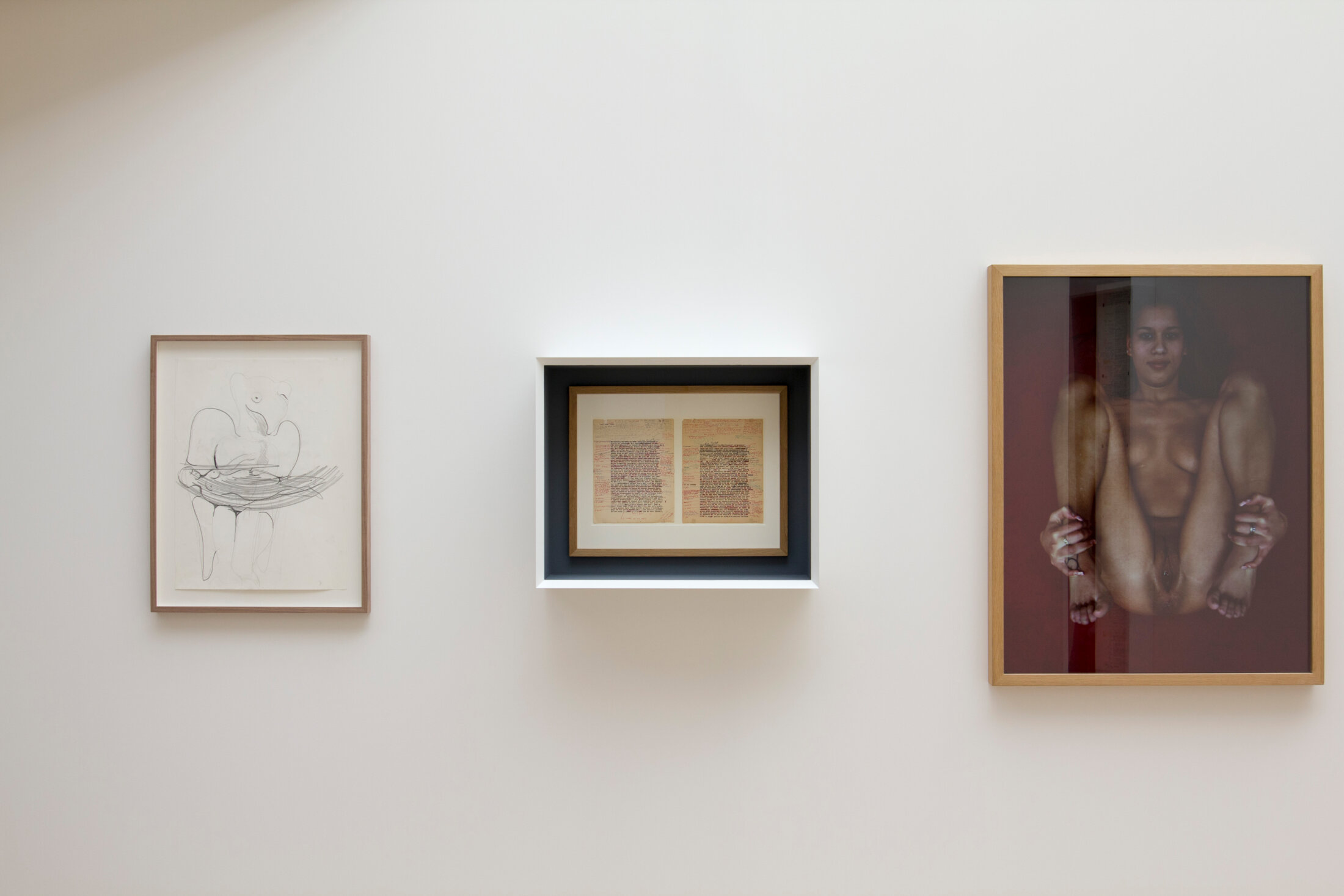 Illisible ? Oui, si l’on s’en tient à une rapide lecture bouche cousue. Ce texte comme ceux de Prostitution, Progénitures et plus encore Le Livre qu’il décrit comme son « grand dessein » en quatrième de couverture (1984), Guyotat dit qu’il les écrit « en langue ». Ils imposent au lecteur d’entrer dedans bouche ouverte, langue active. Lire Guyotat, c’est le dire. Ce n’est pas une occupation pour meubler le temps dans un train ou un tram, c’est une expérience unique. Le texte descend dans la langue (« le rythme, c’est les profondeurs », dit-il) et nous entraîne, il fore sa surface horizontale, réglementée et affadie, met à jour ses muscles, ses os, ses cartilages, son sang. Michael Dean, un des artistes de l’exposition, présente des pièces en regard d’Eden, Eden, Eden, un livre longtemps sous le coup d’une d’interdiction et qui parut en 1970, triplement préfacé par Barthes, Leiris et Sollers. Donatien Grau lui demande ce qu’il éprouve après avoir lu ce livre. Dean : « Du sang pour un muscle ».