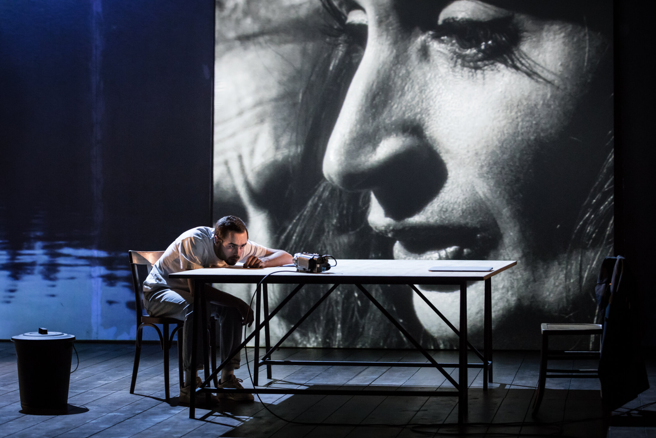 Avec sa Mouette, Cyril Teste explore de nouvelles formes complémentaires : par exemple, plus d’une fois, ce sont les actrices et les acteurs qui tiennent la caméra. Ainsi Treplev filme Nina tout en lui parlant alors qu’un cameraman les filme. Pertinent ici, gadget là. Il est d’autres exemples plus complexes. Le plateau quasiment nu tient de l’atelier du peintre et du studio de cinéma. Des toiles vierges sont dressées à l’arrière-centre du plateau, parfois se superposent et servent de cadre pour des images filmées de chaque côté du plateau (que l’on perçoit) ou derrière (que l’on entrevoit ou pas). C’est techniquement bluffant. Mais c’est un piège : dans cette saturation d’images, ce trop-plein de superpositions, le regard du spectateur (du moins, le mien) se perd, et l’émotion qui va avec. La performance technique brouille la réception et tue l’émotion.