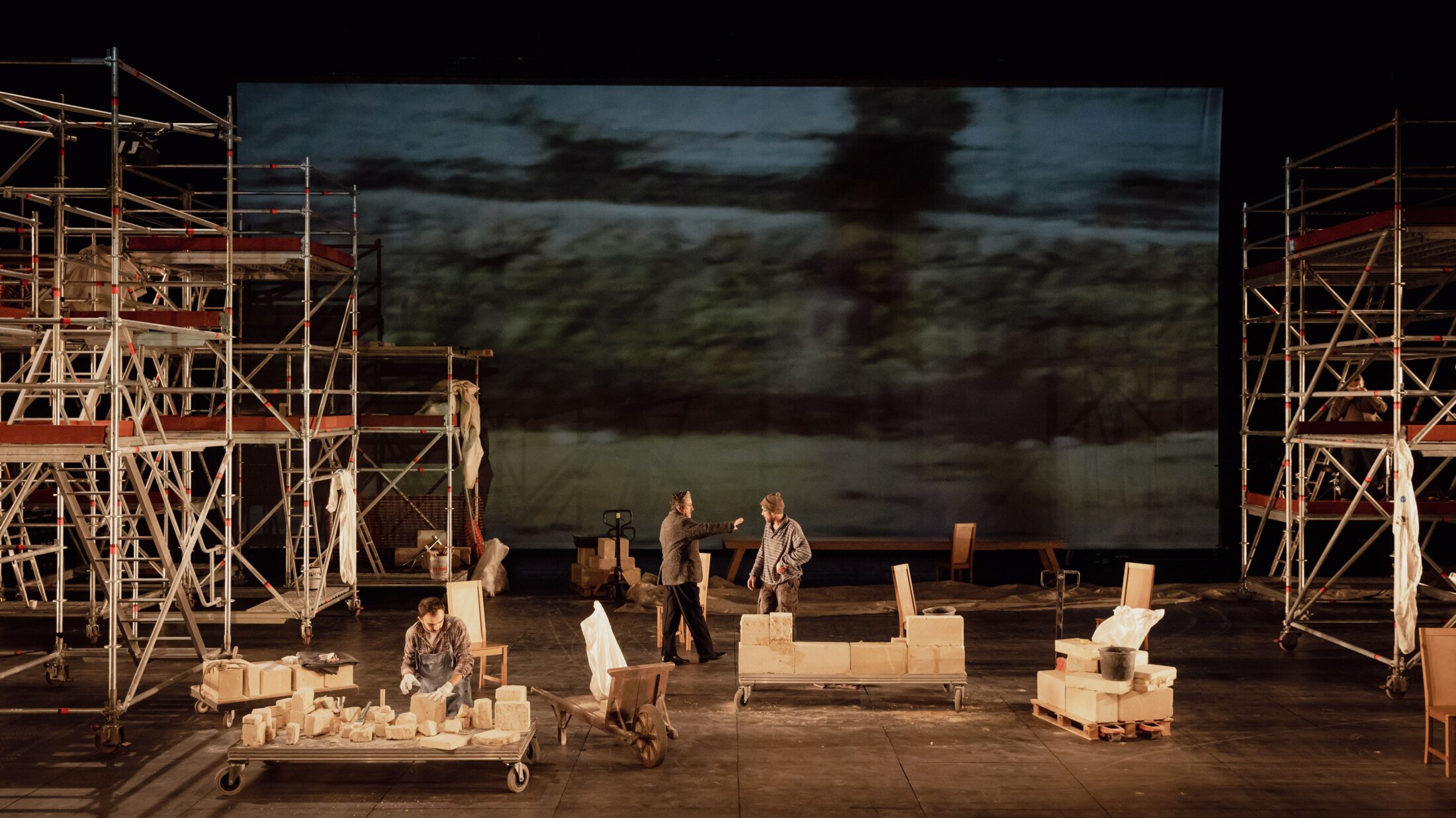 Comment dire ? Ou bien vous avez en mémoire les films et dès lors le spectacle apparaît comme un gros teaser scénique donnant envie de revoir la trilogie filmique. Ou bien vous ignorez tout des films et vous avez de bonnes chances de ne pas vous y retrouver entre les personnages et les différentes strates du temps mais cela vous donnera toutefois envie de voir les films. Le plus douloureux, ce qui disparaît pour ainsi dire sur la scène du théâtre de la Colline, c’est la maison. Et ce ne sont pas les tubulures peuplant la scène qui, en en donnant une vision par trop abstraite, peuvent l’évoquer malgré les éclairages subtils de Jean Kalman. La maison des trois films était une matière, quasi un être, elle devient une idée, une abstraction. Quant au travail des ouvriers palestiniens, bien réel dans le film, il est ici réduit à un consternant faux semblant.