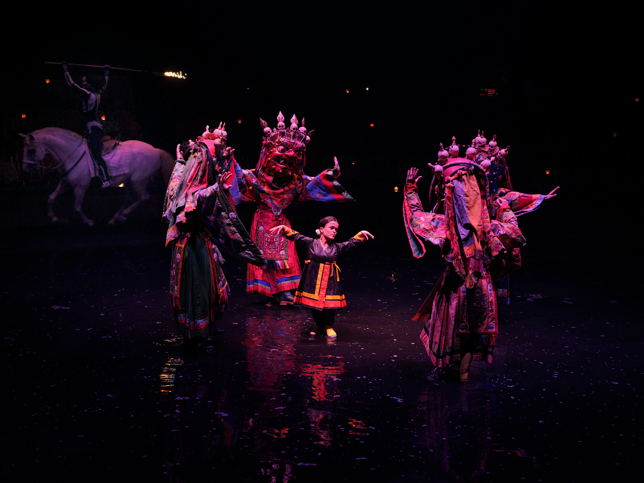 Sur la piste circulaire du cirque Zingaro recouverte d’une mince pellicule d’eau passeront comme des lueurs, une théorie de chevaux au galop sans cavaliers ou harnachés de squelettes, au centre de la piste, sur un îlot, se dresseront des masques et des visages venus de loin, apparaîtra comme dans un rêve une danseuse balinaise (Kadek Puspassat) ou un bouc masqué (Cécile Kretschmar), autant d’éléments saisissants et enchanteurs en contrepoint des récits.