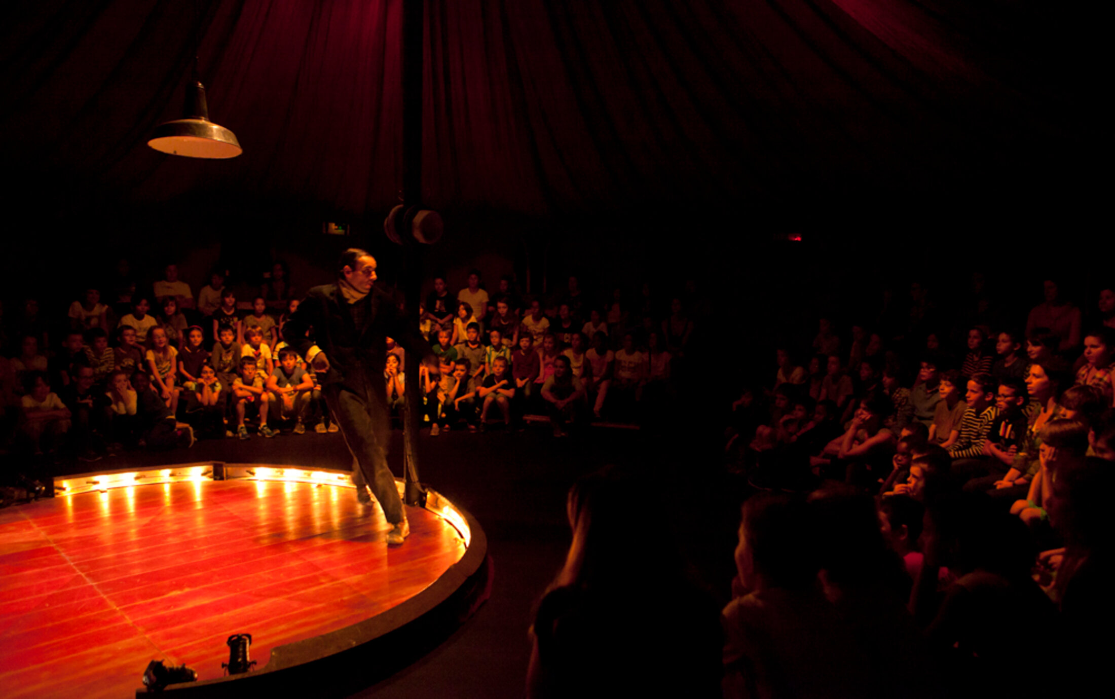 La compagnie Bêtes de foire fait partie de ces petits cirques comme la compagnie Deux rien merci ou les frères Forman qui ont conjointement inventé un univers et une structure pour l’abriter. C’est un chapiteau de taille modeste (onze mètres de diamètre) dont les gradins en bois peuvent accueillir 130 personnes, enfants et adultes logés à la même enseigne. La petite piste circulaire est décentrée, adossée à un bric-à-brac de part et d’autre d’un escalier riquiqui de quatre ou cinq marches. Cela tient du cirque, du cabinet de curiosité, du théâtre de marionnettes et d’objets. C’est la rencontre digne de Lautréamont entre une comédienne-couturière et sa machine à coudre et un circassien, sous l’œil torve d’un chien nommé Sokha qui n’est pas un caniche mais un as de la position alanguie.