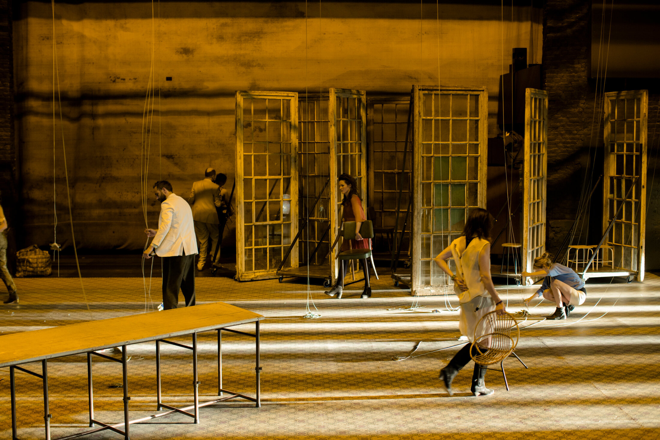 Dans la plupart des mises en scène de la pièce, la danse est souvent reléguée en coulisses ou passe en coup de vent. Ici, elle occupe tout le fond du plateau derrière un mur de grandes baies vitrées un peu décaties surmontées d’invraisemblables stores un peu fatigués. Une danse fortement rythmée, pendant moderne à la danse dont parle Tchekhov. Elle prend une place considérable (espace, durée). Une danse rituelle de l’adieu à la maison. Tout le monde est en ligne mais chacun danse seul.