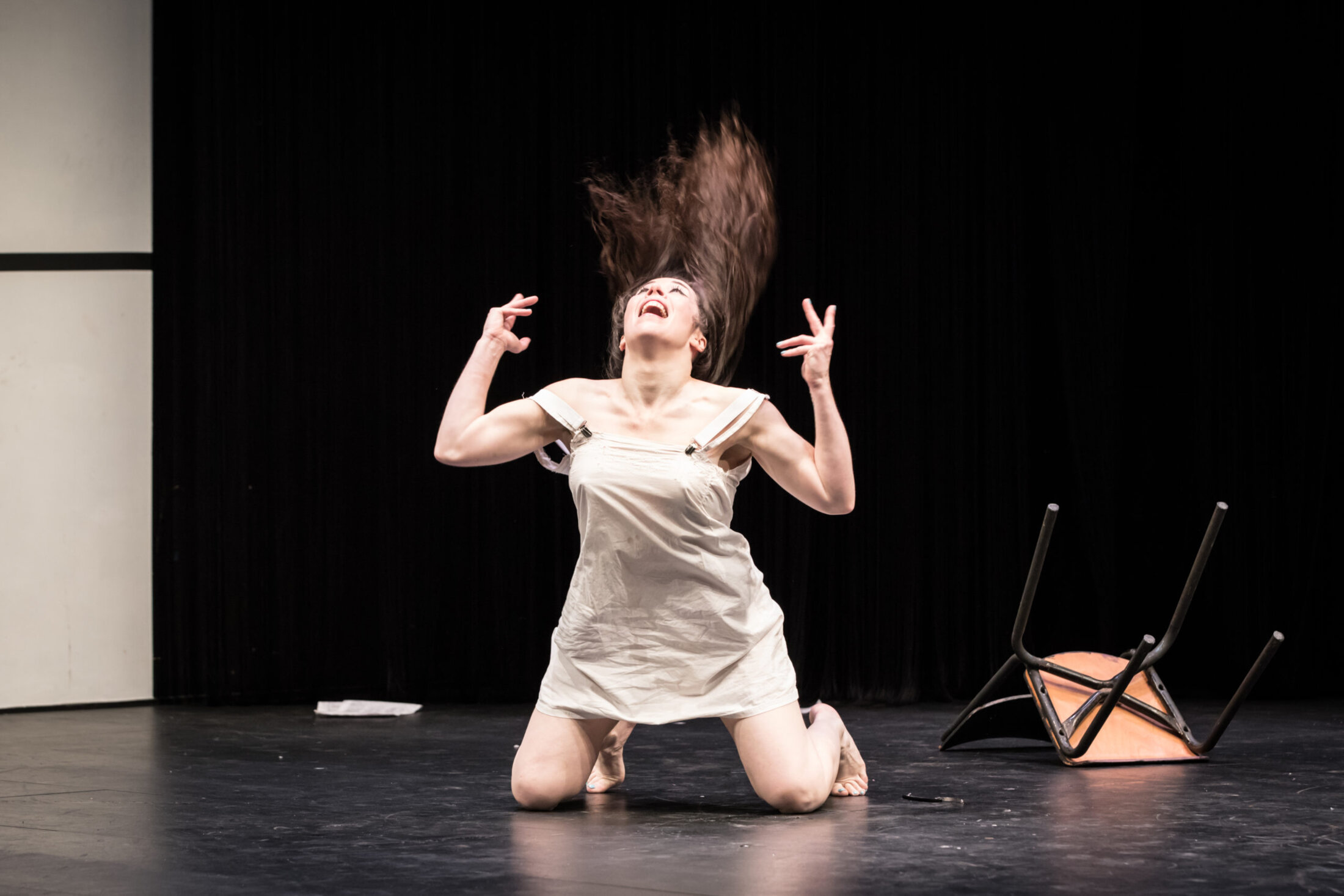 En m’asseyant dans la salle, j’avais bien vu sur le mur du fond, une légère encoche et puis j’avais oublié, pris par le spectacle qui commençait dans mon dos : l’actrice Karelle Prugnaud allongée devant la cabine régie commençait un long monologue qui devait l'emmener sur scène dans la folie de Lucia, la fille de James Joyce, danseuse à ses heures. Jung déclarera Lucia schizophrène, elle sera internée. Tous les joyciens ont rêvé d’elle à commencer par son père James, elle est comme le fantôme de Finnegans Wake, cette œuvre extrême, folle de langues. Fasciné par ce personnage fuyant et ensorcelant, l’auteur dramatique Eugène Durif a écrit Le cas Lucia J. En voyant l’actrice Karelle Prugnaud interpréter le rôle on croirait que la pièce a été écrite pour elle, tant l’actrice est magnifiquement incendiaire mise en scène par Eric Lacascade qui la pousse au plus loin.