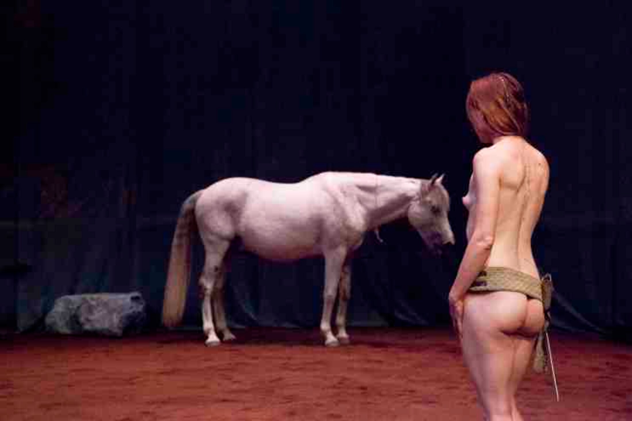 Lætitia Dosch arrive côté jardin, ôte son peignoir, passe sous le fil, foule le sol sombre terreux. Elle s’avance vers Corazon, nue, portant à la ceinture une épée en bois de gamin et une banane remplie non d’euros mais de carottes coupées en rondelles. Elle regarde Corazon, un frémissement du poil semble dire qu’il a remarqué sa venue. Ça n’a pas l’air de lui déplaire. Beau début.