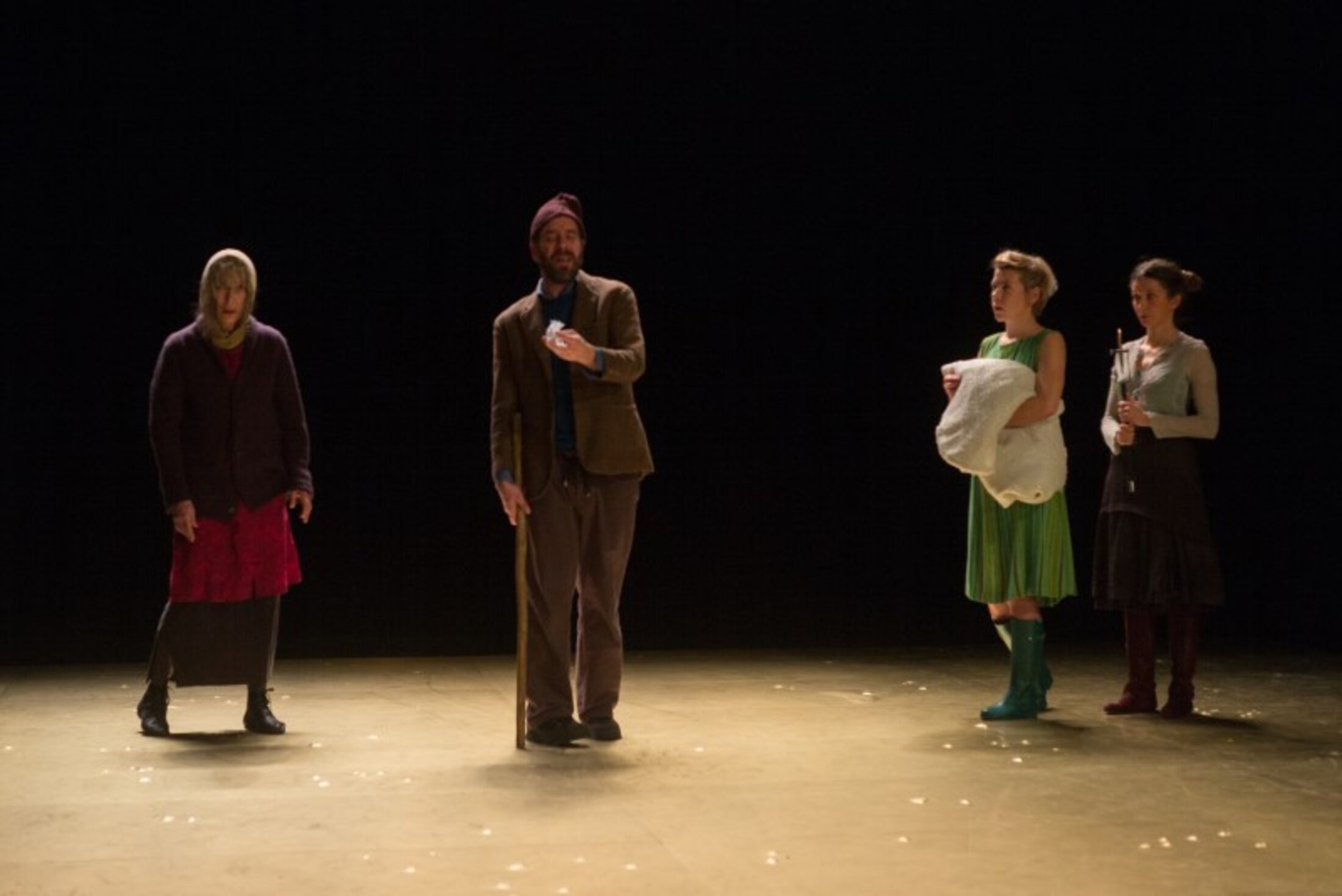 Hormis Le Baladin du monde occidental, on connaît peu en France les pièces de Synge (son Théâtre a été traduit par Françoise Morvan, chez Actes Sud). Il faut remercier Michel Cerda d’avoir mis en scène sans fioritures La Source des saints (Morvan préfère traduire plus littéralement « La Fontaine des saints ») en se tenant au plus près de la langue et des corps. Et il faut remercier Noëlle Renaude d’avoir recherché – et trouvé – en français un pendant à la langue de Synge faite d’herbes noueuses, de rocaille, de boue et de brume (traduction une première fois jouée dans une mise en scène de Bruno Sachel en 2003 à l’Equinoxe de Châteauroux). Quand on assiste à une représentation d’une pièce d’un auteur du XVIIe siècle, Racine par exemple, on a besoin de quelques répliques pour apprivoiser la langue avant de tout comprendre et c’est exactement ce qui se passe avec Synge traduit par Renaude, c’est un bon signe.